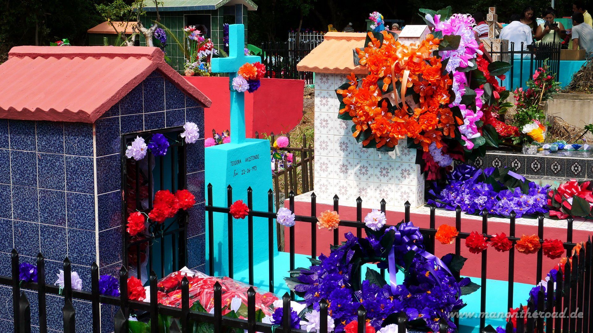 Heute reisen wir nach El Salvador ein, in das ¨gefährlichste Land der Welt¨. An der Grenze werden wir von überaus freundlichen Grenzern empfangen und geleitet. Es sieht recht modern aus und große Plakate weisen darauf hin, dass hier keine Korruption geduldet wird und man bei Unregelmässigkeiten sofort Meldung erstatten soll. Es ist Sonntag, der 2. November und bereits auf dem ersten Friedhof ist eine große Menschenmenge zwischen den buntgeschmückten Grabstätten unterwegs. Überall wird getrunken, gegessen und fröhlich gefeiert. Wir halten sofort an und werden von den Einheimischen freundlich begrüßt. Wir essen und trinken an einer der vielen Garküchen bevor wir weiterfahren. Die Landschaft ist hügelig und sehr grün. Überall wachsen Kaffeepflanzen, die häufig unter großen Bäumen zur Beschattung gepflanzt werden. In den Bergen sehen wir am Straßenrand einige aus Holz gebaute, abenteuerliche Transportgefährte, die für den Brennholztransport ins Tal mit den Füssen gelenkt werden. Gebremst wird mit einem Hebel, der einen Holzklotz gegen die Lauffläche der hinteren Räder drückt. Dies ist auf den abschüssigen Straßen hier ein ziemlich riskantes Manöver.