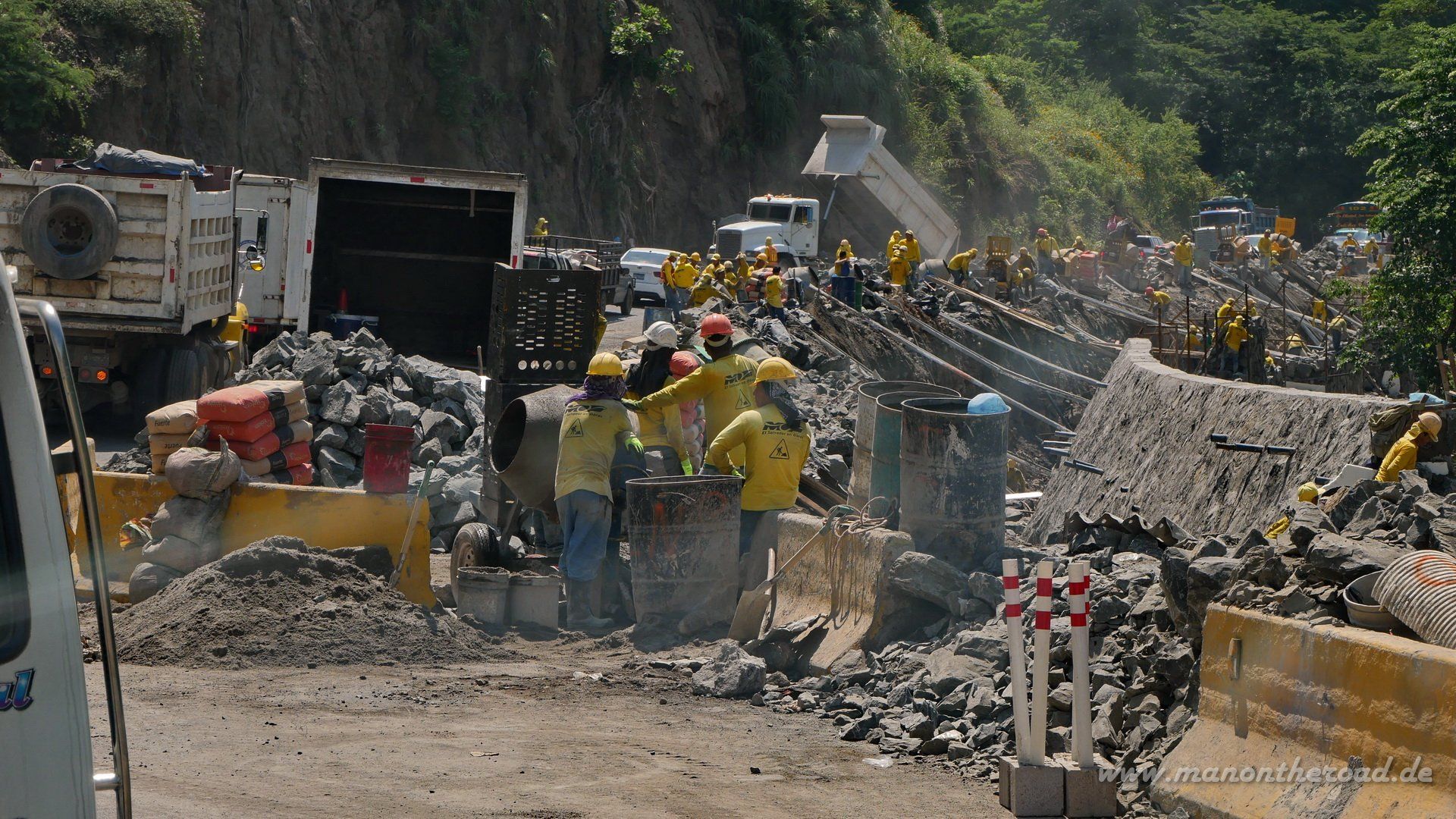 Nach unserem Aufenthalt in der Nähe der Hauptstadt besuchen wir den Nationalpark El Boqueron. Man schaut von oben in einen hochgelegenen Vulkankrater, der innen komplett grün bewachsen ist. Auf unserem weiteren Weg zum Meer kommen wir an zahllosen langen Straßenbaustellen vorbei, an denen die Arbeiten mit wenig Maschinen, dafür aber mit unglaublich vielen Menschen bewerkstelligt werden.