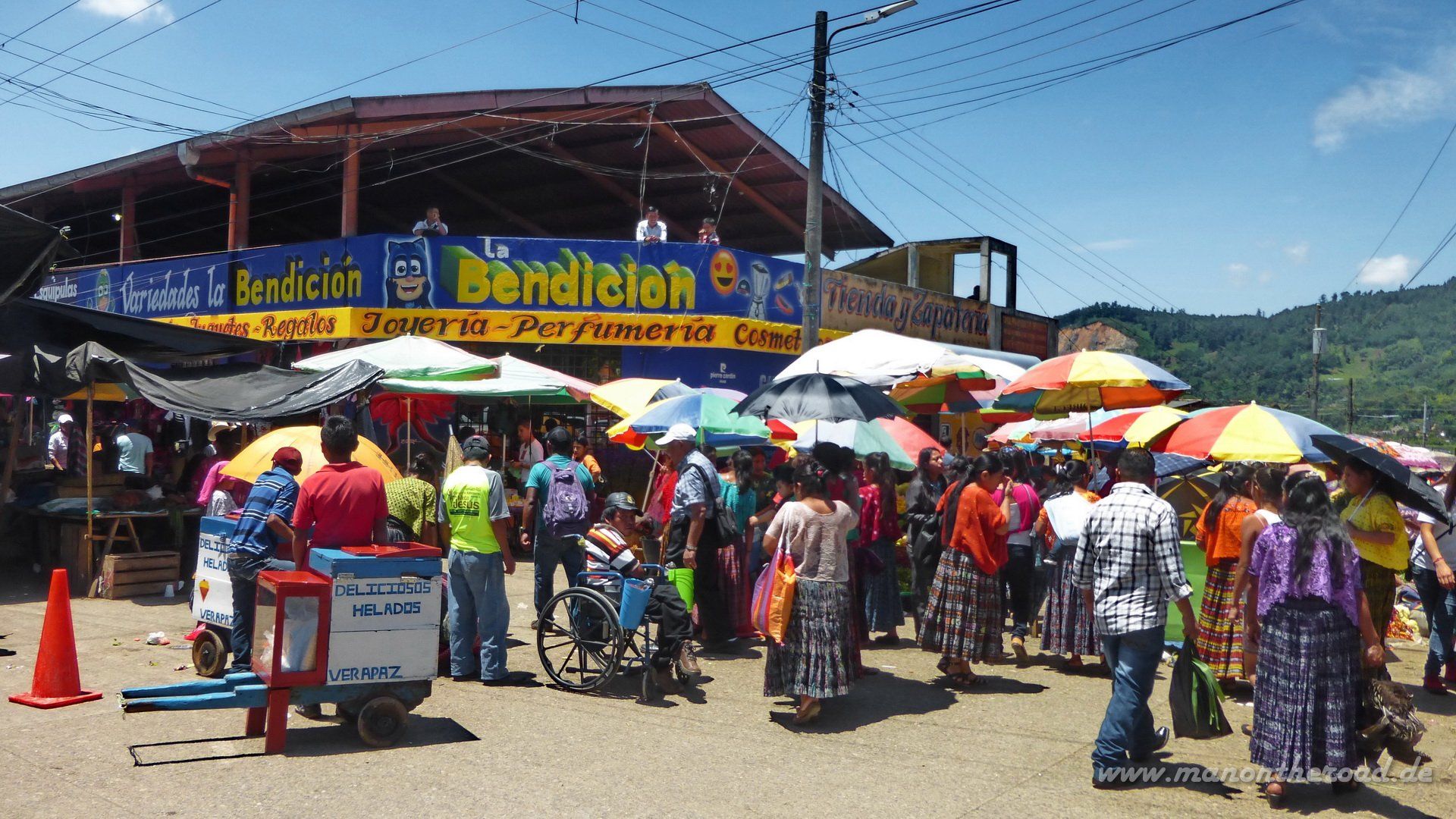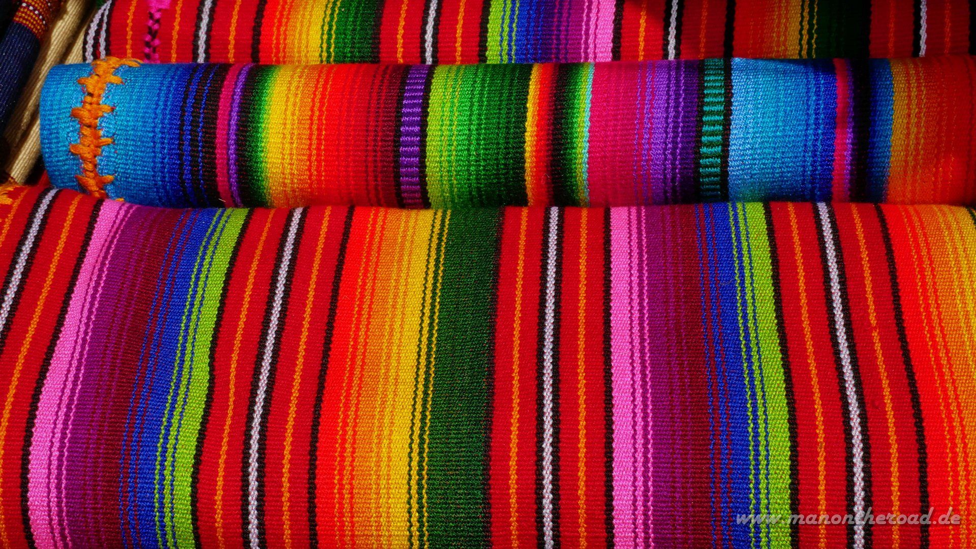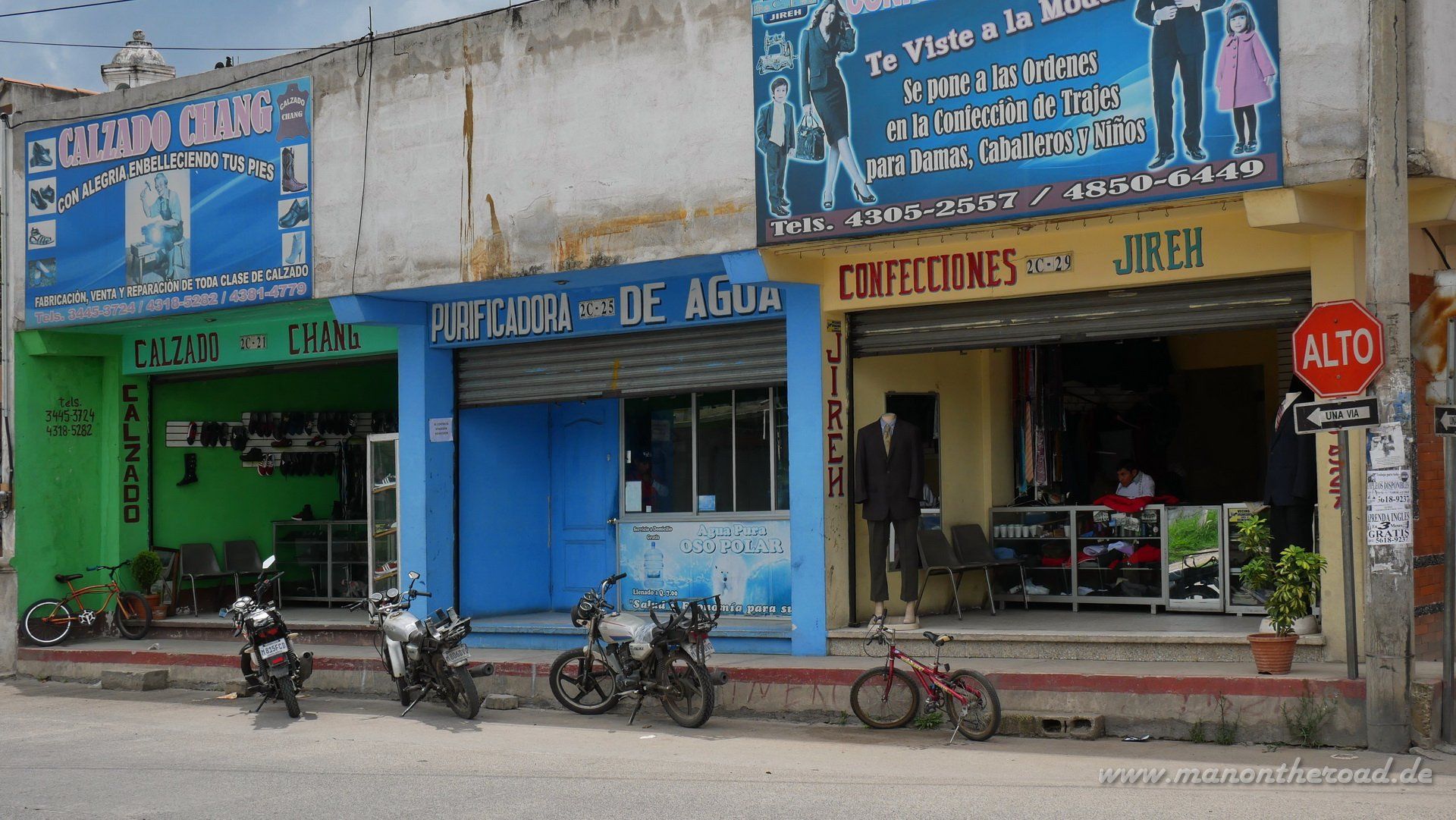 Wir kaufen Gemüse und Obst auf dem Markt und lassen uns von den extremen Geräuschen und Gerüchen berieseln. Überall gibt es Liquados de Frutas - also Smoothies. Das habe ich in Mexiko total vermisst. Besonders lecker sind Liquados de Sandia (Wassermelone). Aus jedem Laden dröhnt eine andere Musik, die Laster brettern durch die Gassen, es wird gehupt, was das Zeug hält..... Nichts für empfindliche Ohren und Nasen. Der Ort Salcajá ist bekannt für seine unzähligen Webereien und die dazugehörigen Geschäfte mit Nähgarn und weiterem Nähzubehör.