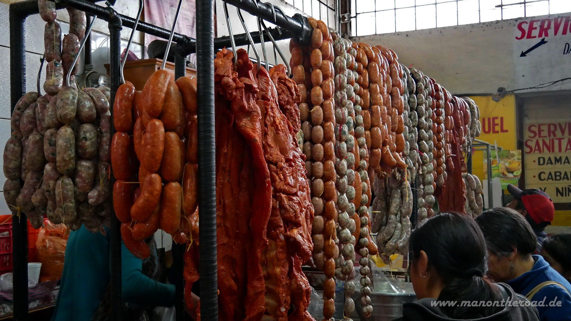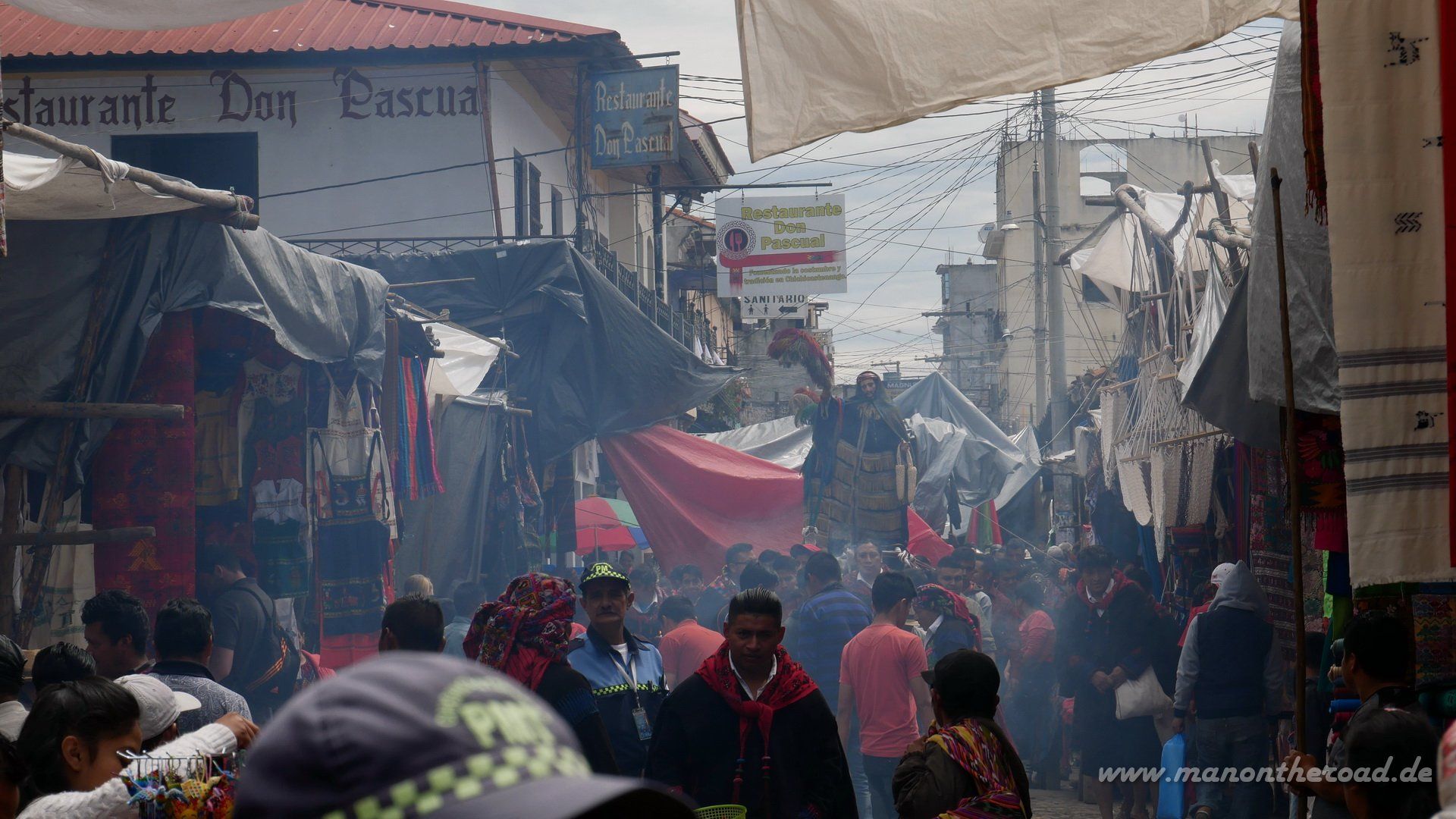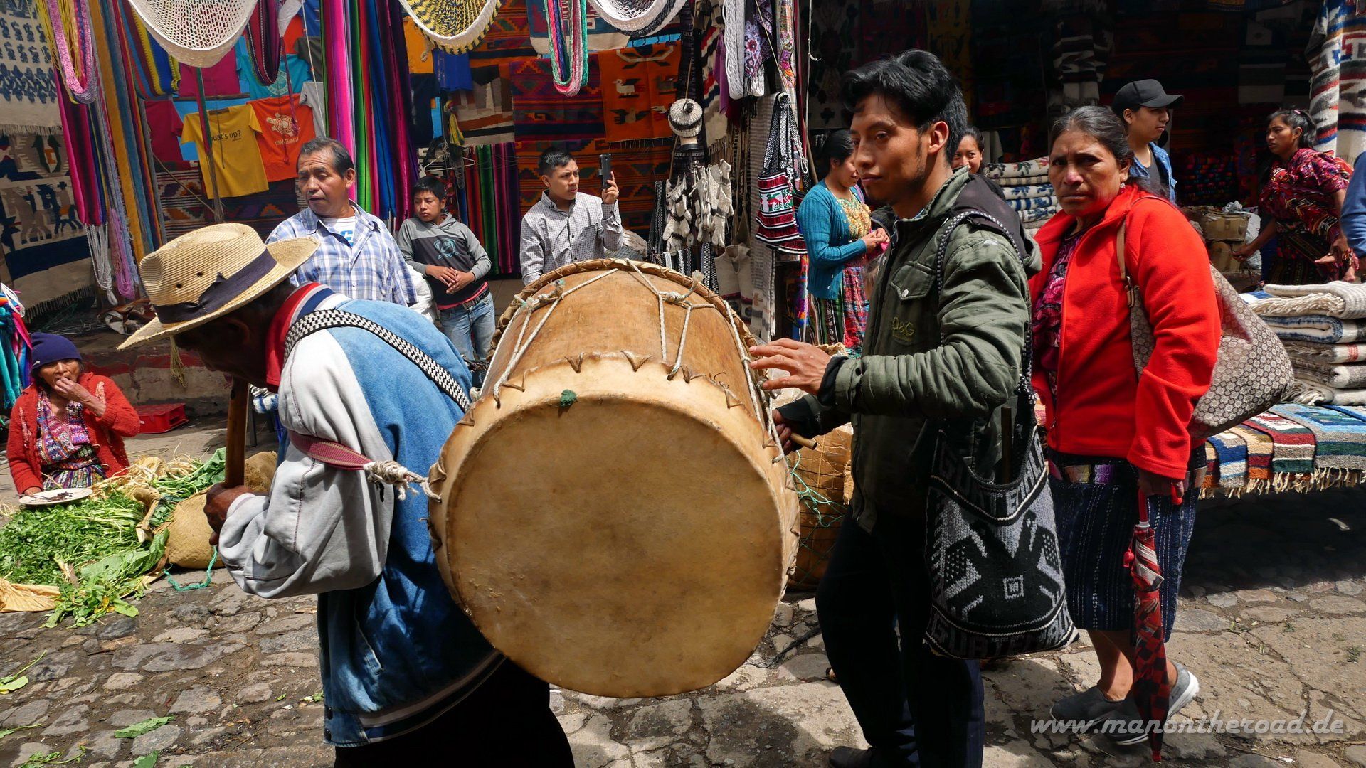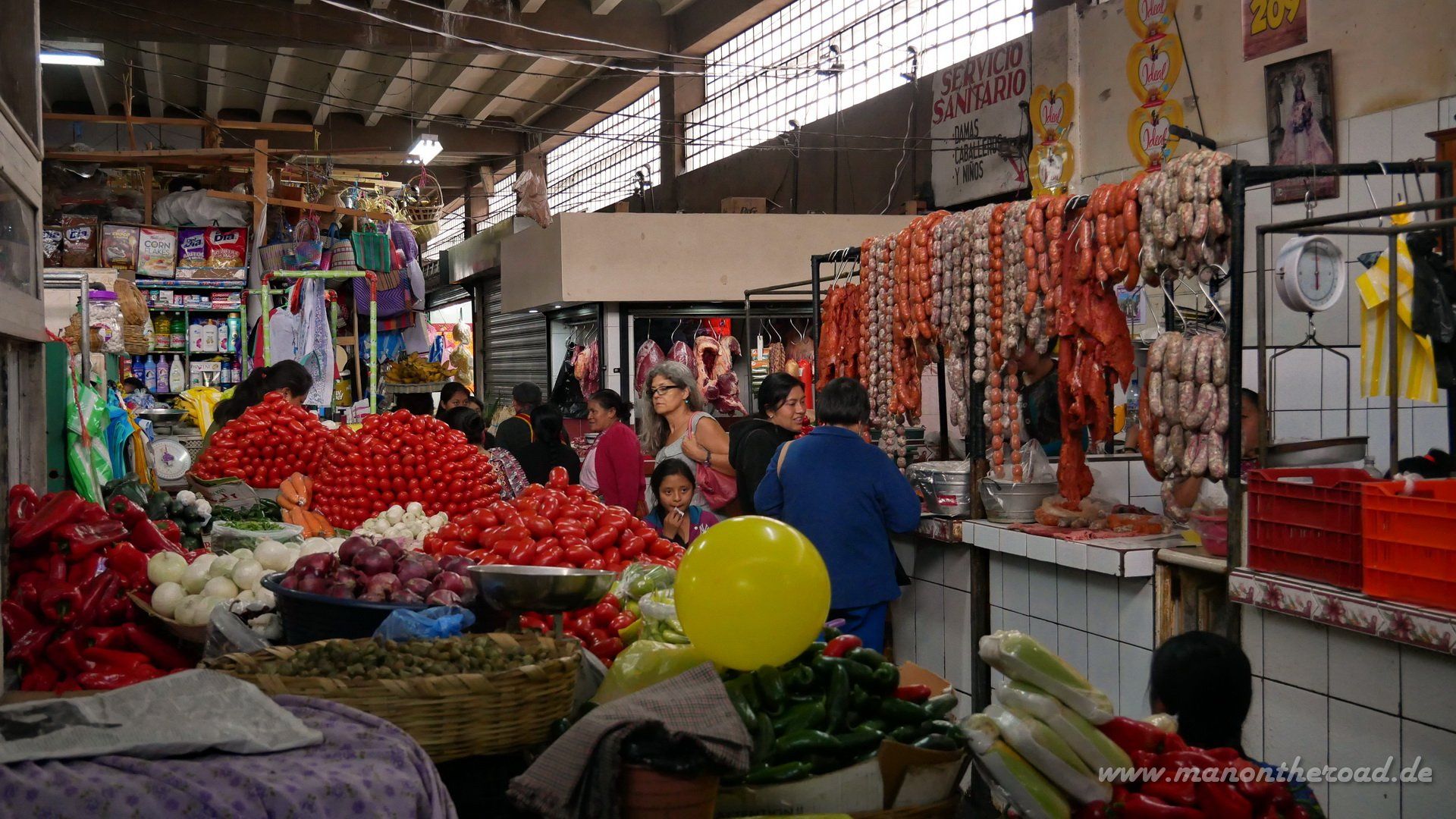 Nach dem gemeinsamen Frühstück im Auto fahren wir alle vier in einem engen Moto-Taxi zum berühmten Markt. Dieser Markt schlägt wirklich alles bisher Gesehene in seiner Fülle an Obst und Gemüse, Kunsthandwerk, gewebter Traditionskleidung, Hängematten, Federvieh usw....... Wir tauchen ein in das unüberschaubare Labyrinth der Gassen und Gässchen, alle übersät mit Ständen. Die Menschen gehören fast ausschließlich zur indigenen Bevölkerung in ihren traditionellen Trachten. Es ist einfach fantastisch und wir können uns kaum satt sehen. Da heute Sonntag ist, wird auch noch in einer Prozession eine Monstranz mit großer Jesus-Figur, begleitet von den Weihrauchträgern, durch die engen Gassen getragen. Besonders vor der Kirche herrscht ein reges Treiben und die Luft ist auch hier weihrauchgeschwängert.