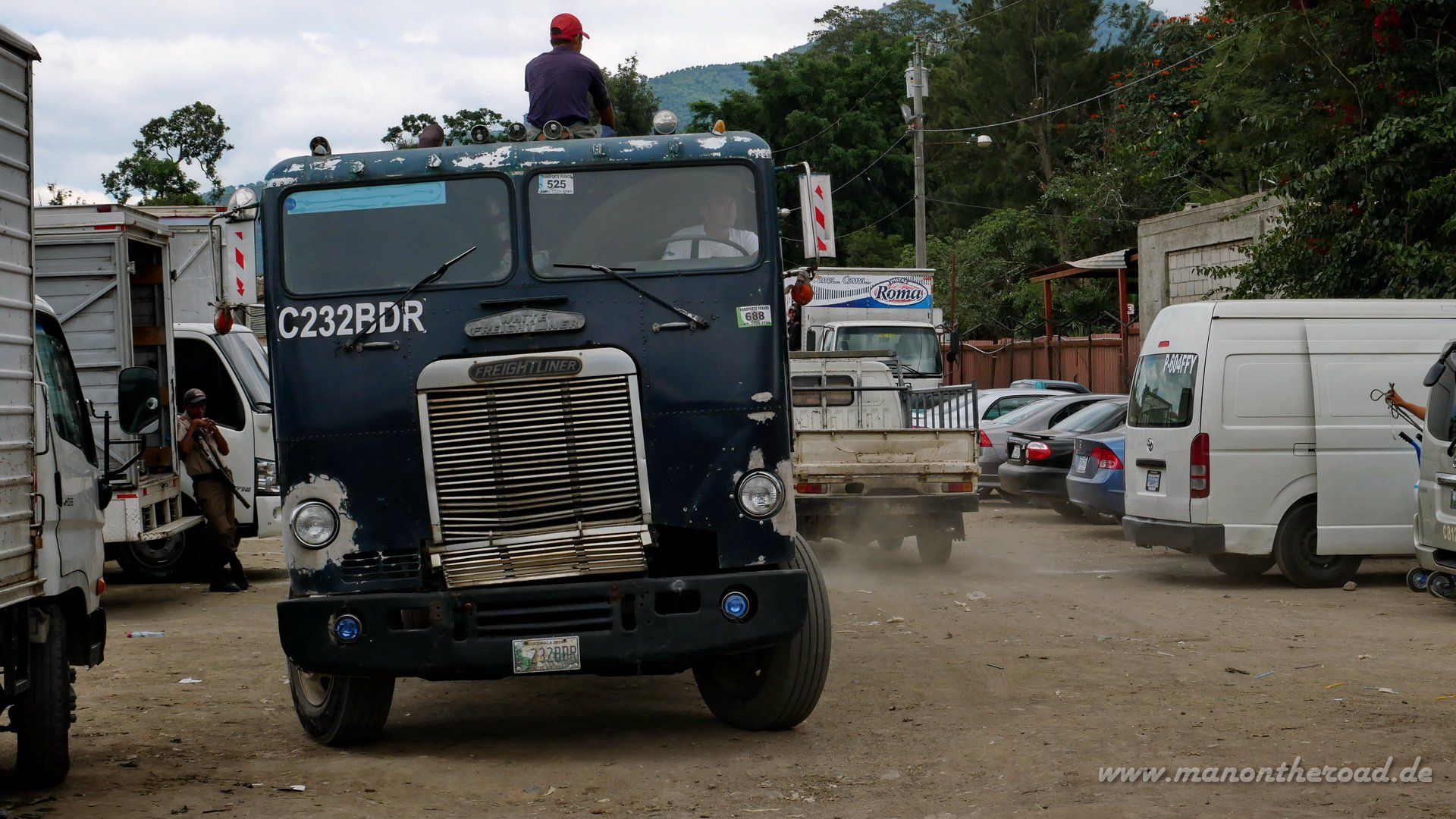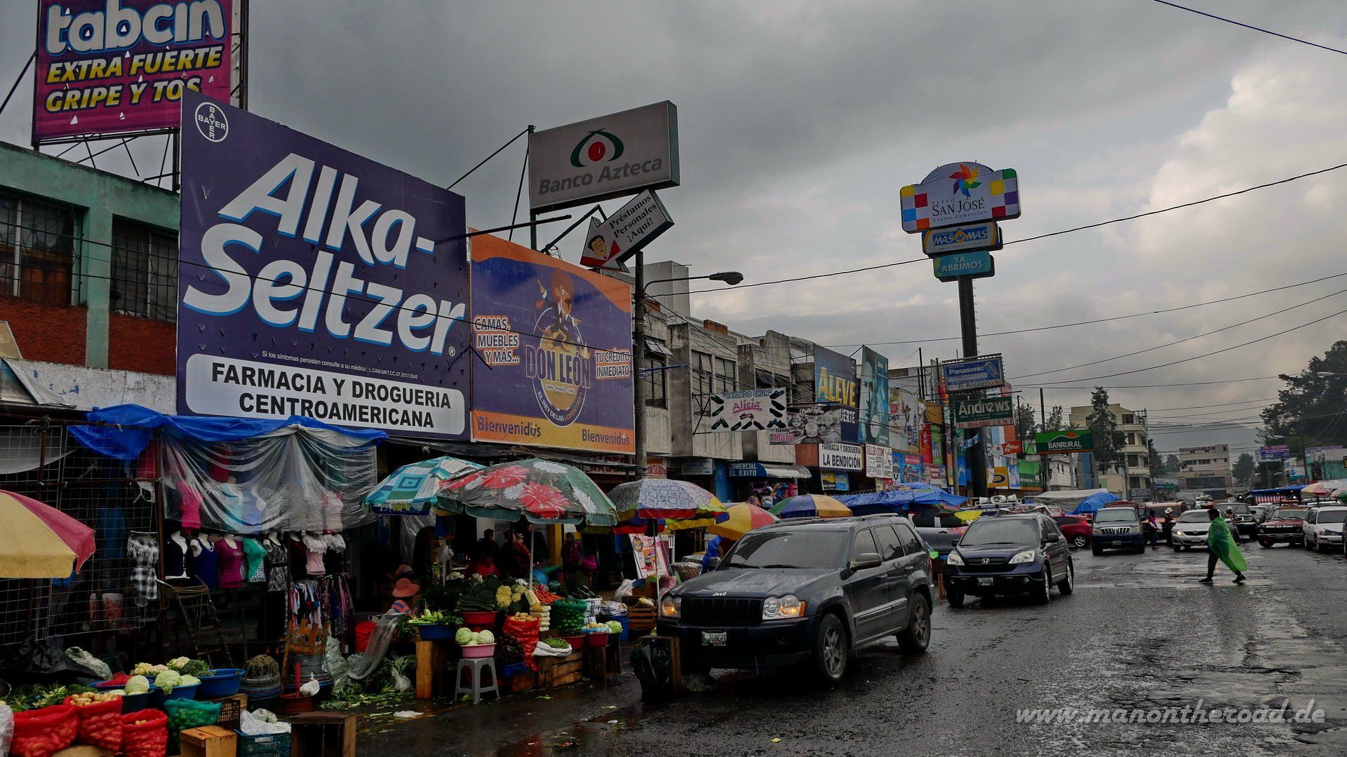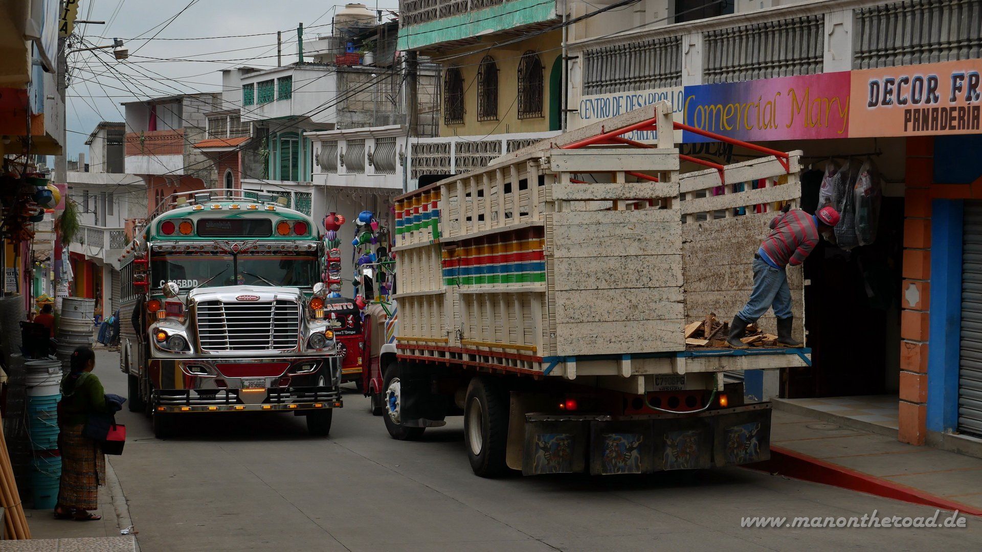 Reichlich angetickert fahren wir aber trotzdem noch weiter auf relativ schwieriger und enger Strasse, sowie teilweise rumpeliger und nach dem Regen auch matschiger Piste bis nach Chichicastenango. Wir kommen erst im Dunkeln vor dem kleinen Hotel in der Altstadt an, wo wir uns mit dem MAN einmal wieder festfahren, eine Faserzement-Dachplatte beschädigen und nur unter Mühen wieder herauskommen.