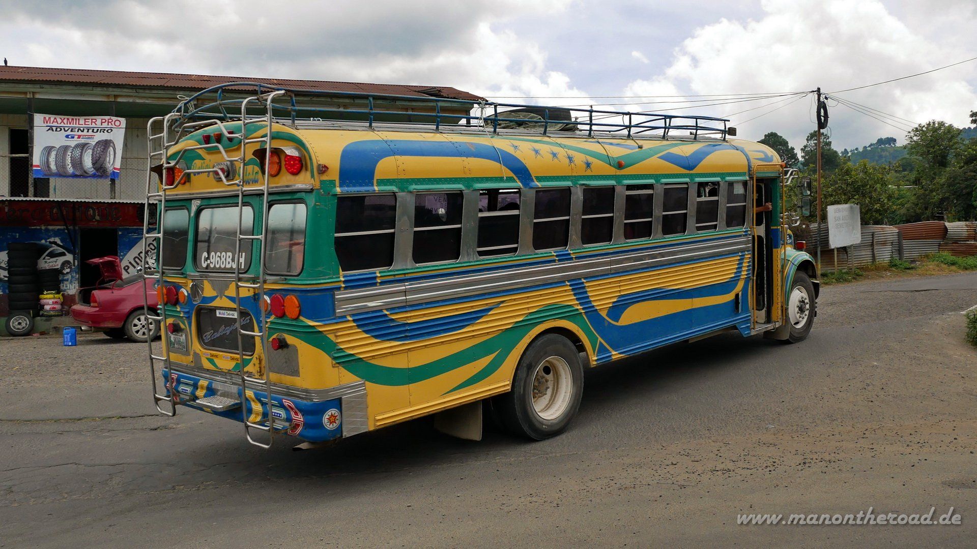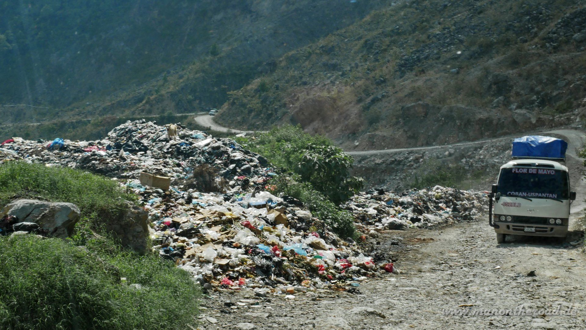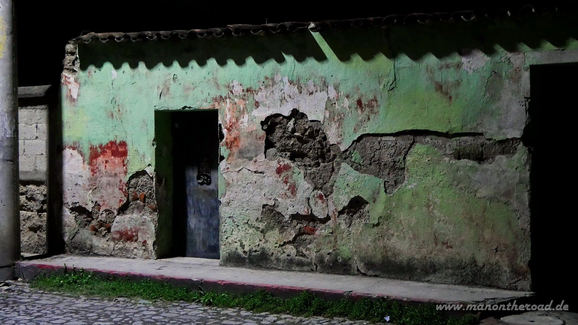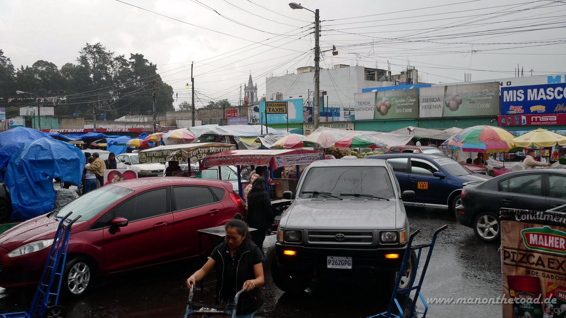 Reichlich angetickert fahren wir aber trotzdem noch weiter auf relativ schwieriger und enger Strasse, sowie teilweise rumpeliger und nach dem Regen auch matschiger Piste bis nach Chichicastenango. Wir kommen erst im Dunkeln vor dem kleinen Hotel in der Altstadt an, wo wir uns mit dem MAN einmal wieder festfahren, eine Faserzement-Dachplatte beschädigen und nur unter Mühen wieder herauskommen.