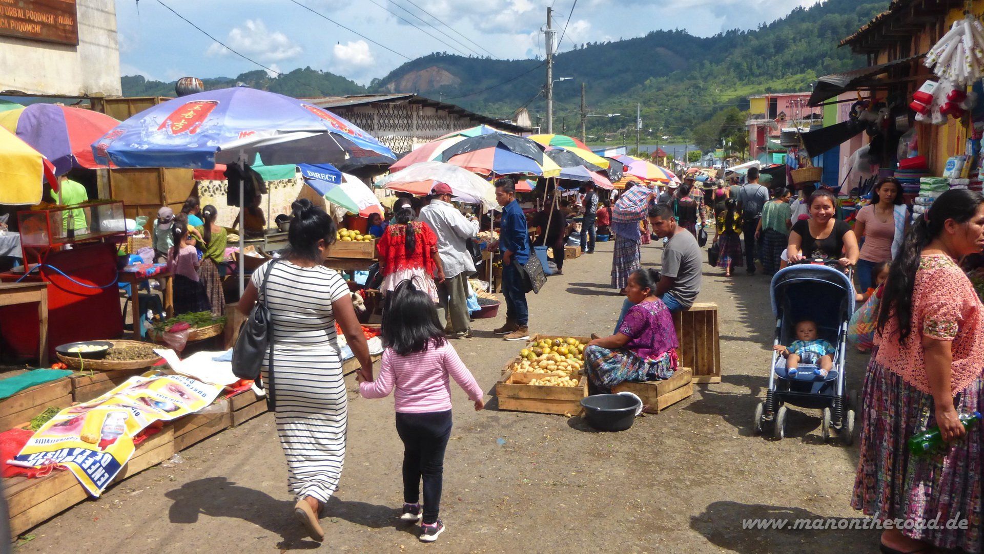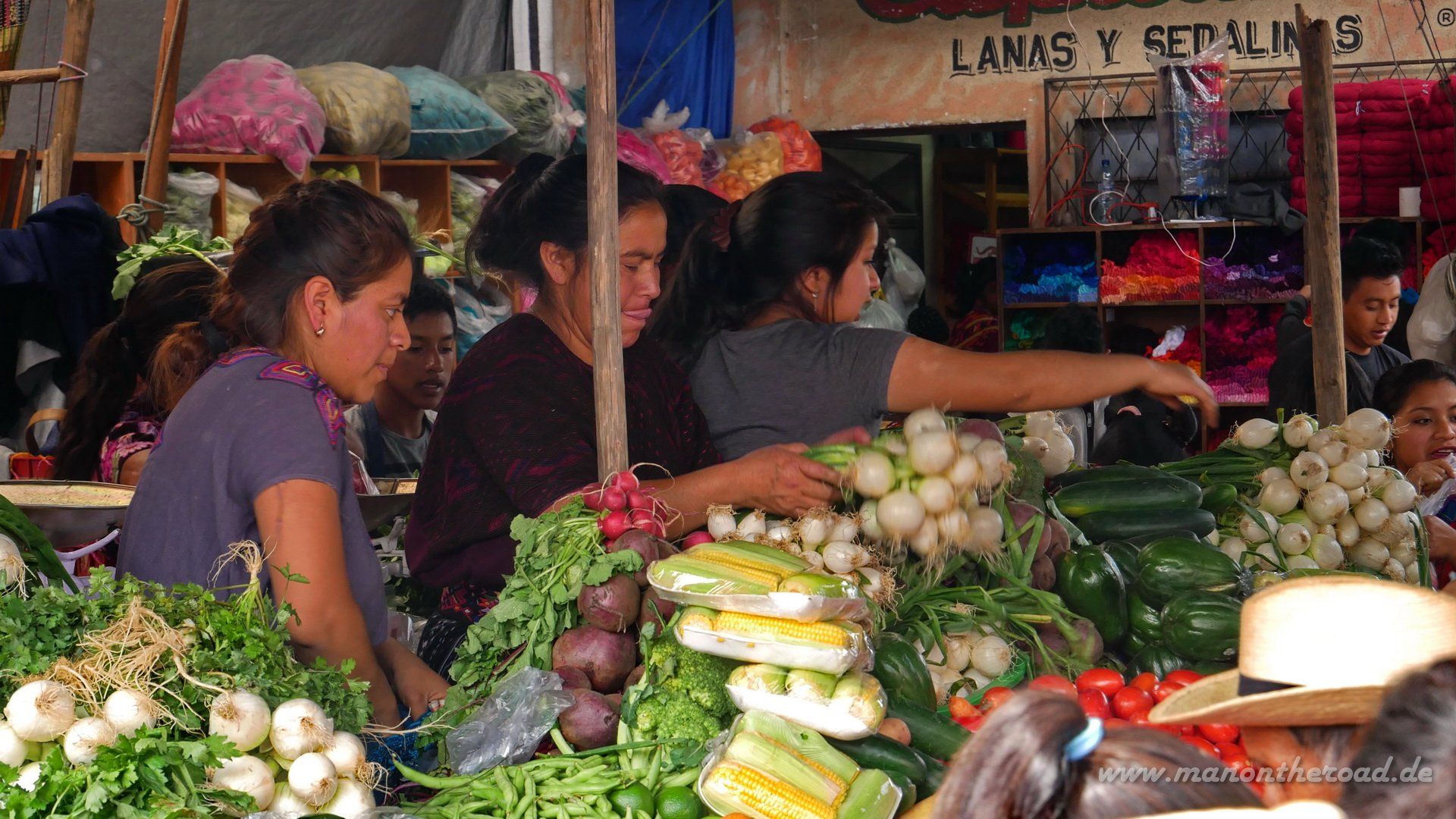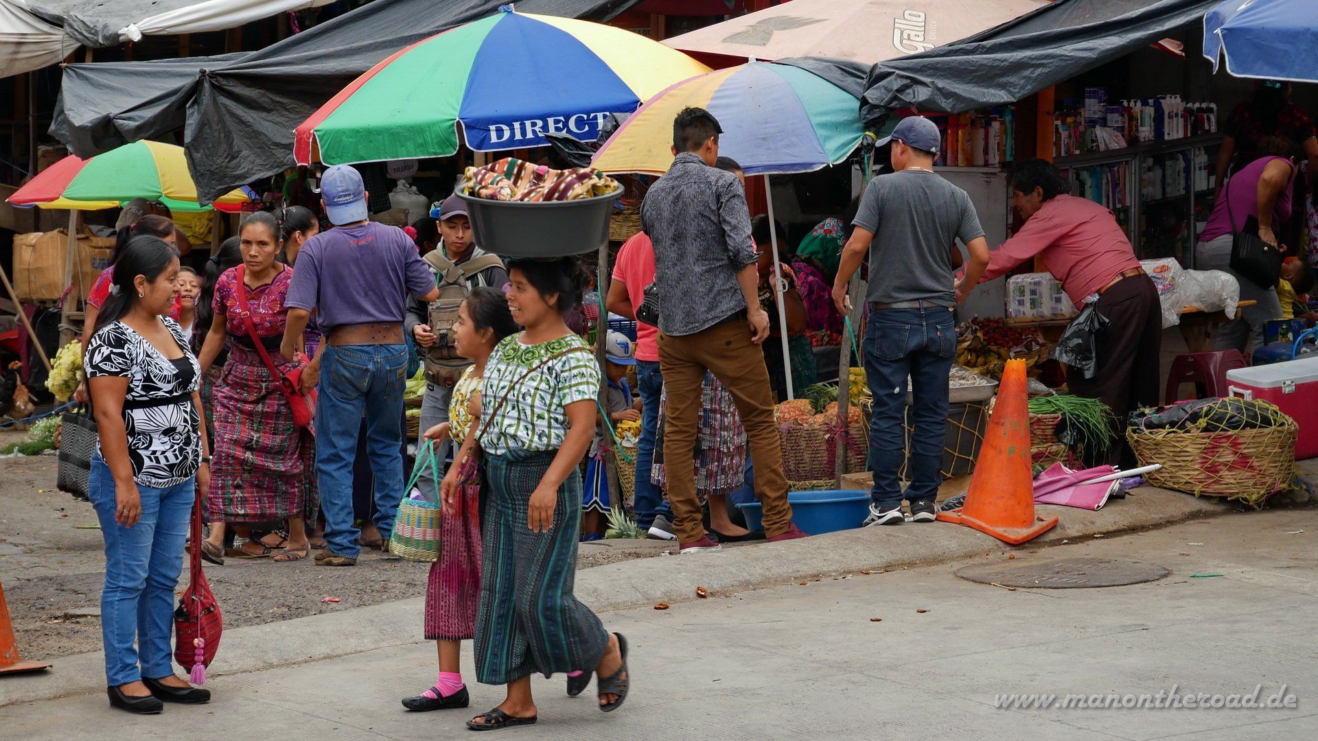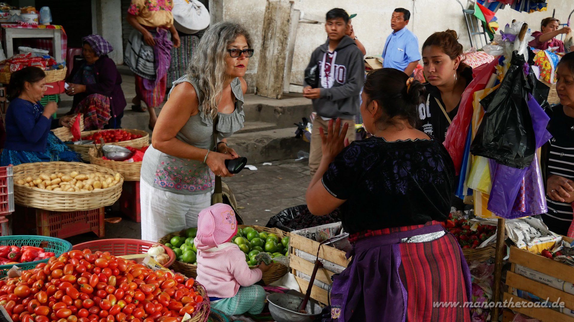 Wir überqueren die Grenze nach Guatemala mit den üblichen und etwas umständlichen Abwicklungsprozeduren. Diese Grenze hat man jetzt im Zusammenhang mit den Honduras-Flüchtlingen im Herbst 2018 auf ihrem Weg in die USA öfter im TV gesehen. In Quetzaltenango kümmern wir uns zuerst um eine Karte für den Internetzugang und unseren Hot-Spot im MAN. Die Landschaft auf dem Weg dorthin begeistert uns sofort. Es ist bergig, grün und bis in höchste Höhen landwirtschaftlich bewirtschaftet. Überall wächst Gemüse wie Kohl, Möhren, Chili, Blumenkohl, Zwiebeln und und und. Alles wird hier in mühsamer Handarbeit und mit einfachsten Werkzeugen bearbeitet. Die Menschen hier sind zierlich und klein und fast alle tragen noch die bunte Tracht. Das gefällt uns sehr gut. Alle lachen und sind superfreundlich, winken und grüßen. Das ist sehr erfrischend nach den verschlossenen und mürrisch dreinblickenden Mexikanern. Die Straßenszenen sprechen ja für sich.
