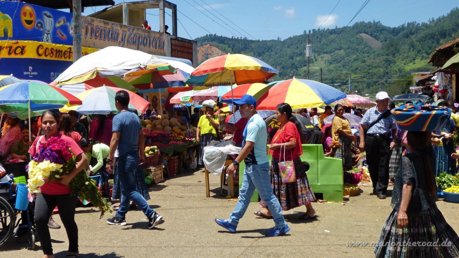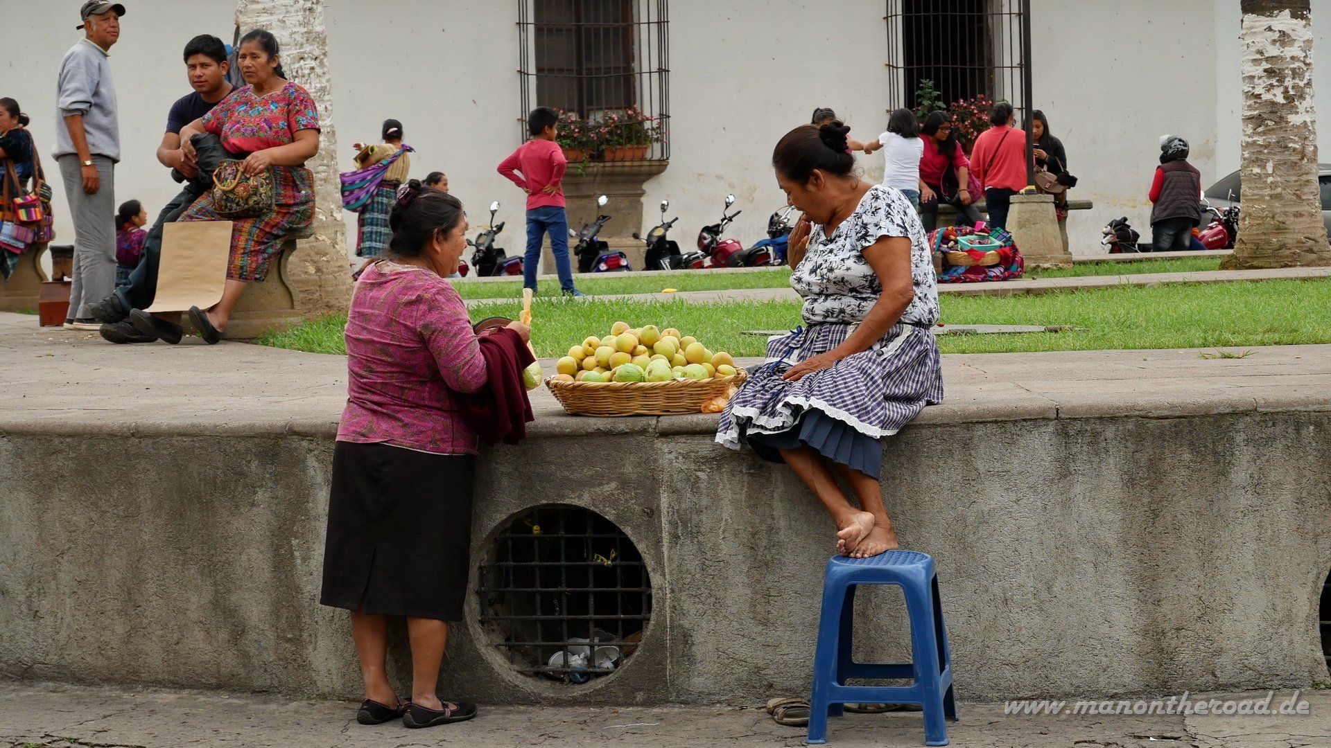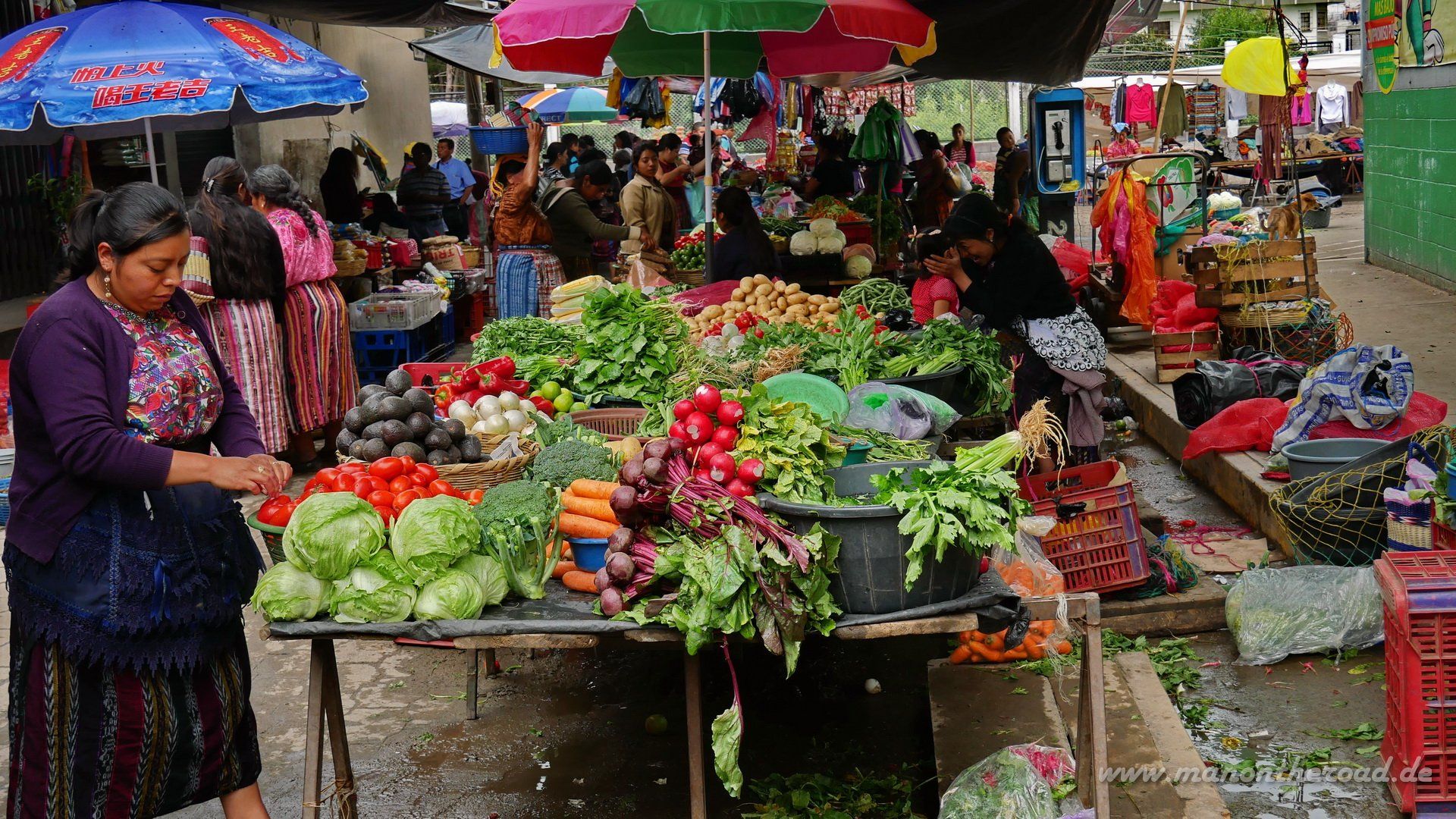 Wir überqueren die Grenze nach Guatemala mit den üblichen und etwas umständlichen Abwicklungsprozeduren. Diese Grenze hat man jetzt im Zusammenhang mit den Honduras-Flüchtlingen im Herbst 2018 auf ihrem Weg in die USA öfter im TV gesehen. In Quetzaltenango kümmern wir uns zuerst um eine Karte für den Internetzugang und unseren Hot-Spot im MAN. Die Landschaft auf dem Weg dorthin begeistert uns sofort. Es ist bergig, grün und bis in höchste Höhen landwirtschaftlich bewirtschaftet. Überall wächst Gemüse wie Kohl, Möhren, Chili, Blumenkohl, Zwiebeln und und und. Alles wird hier in mühsamer Handarbeit und mit einfachsten Werkzeugen bearbeitet. Die Menschen hier sind zierlich und klein und fast alle tragen noch die bunte Tracht. Das gefällt uns sehr gut. Alle lachen und sind superfreundlich, winken und grüßen. Das ist sehr erfrischend nach den verschlossenen und mürrisch dreinblickenden Mexikanern. Die Straßenszenen sprechen ja für sich.