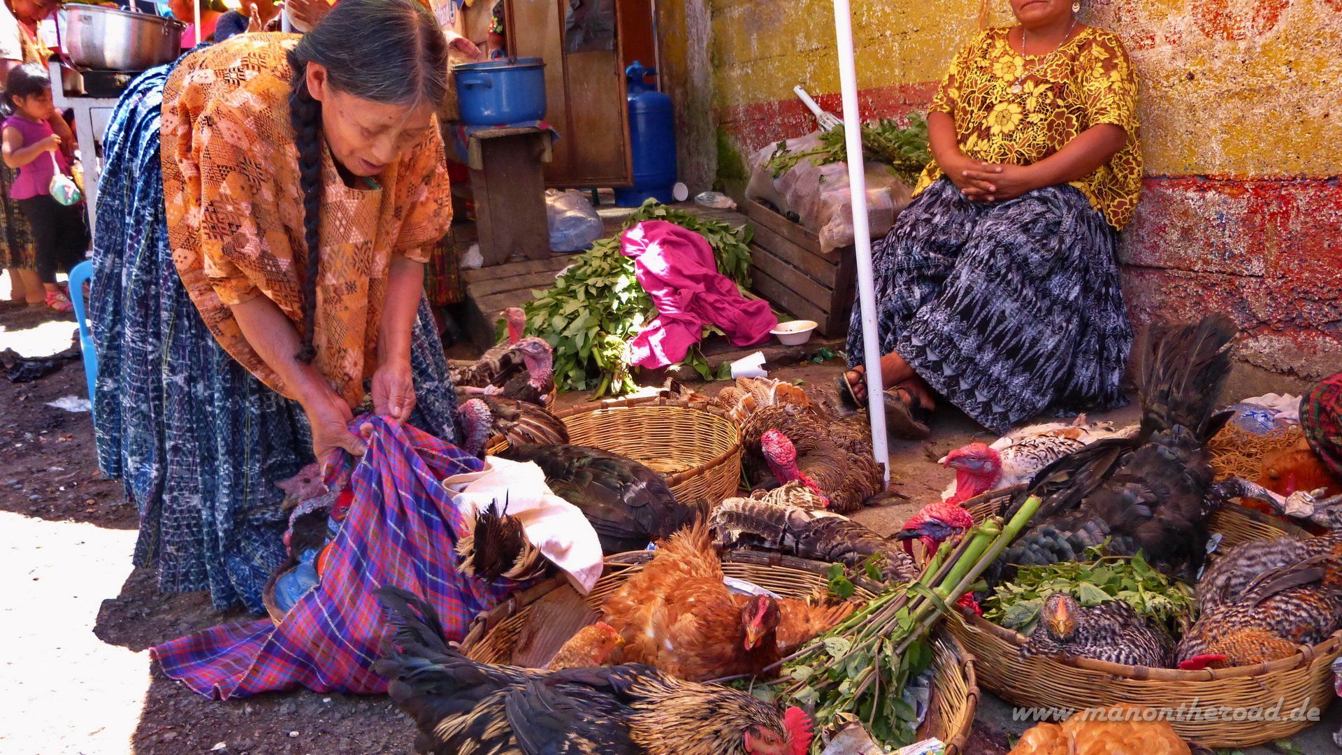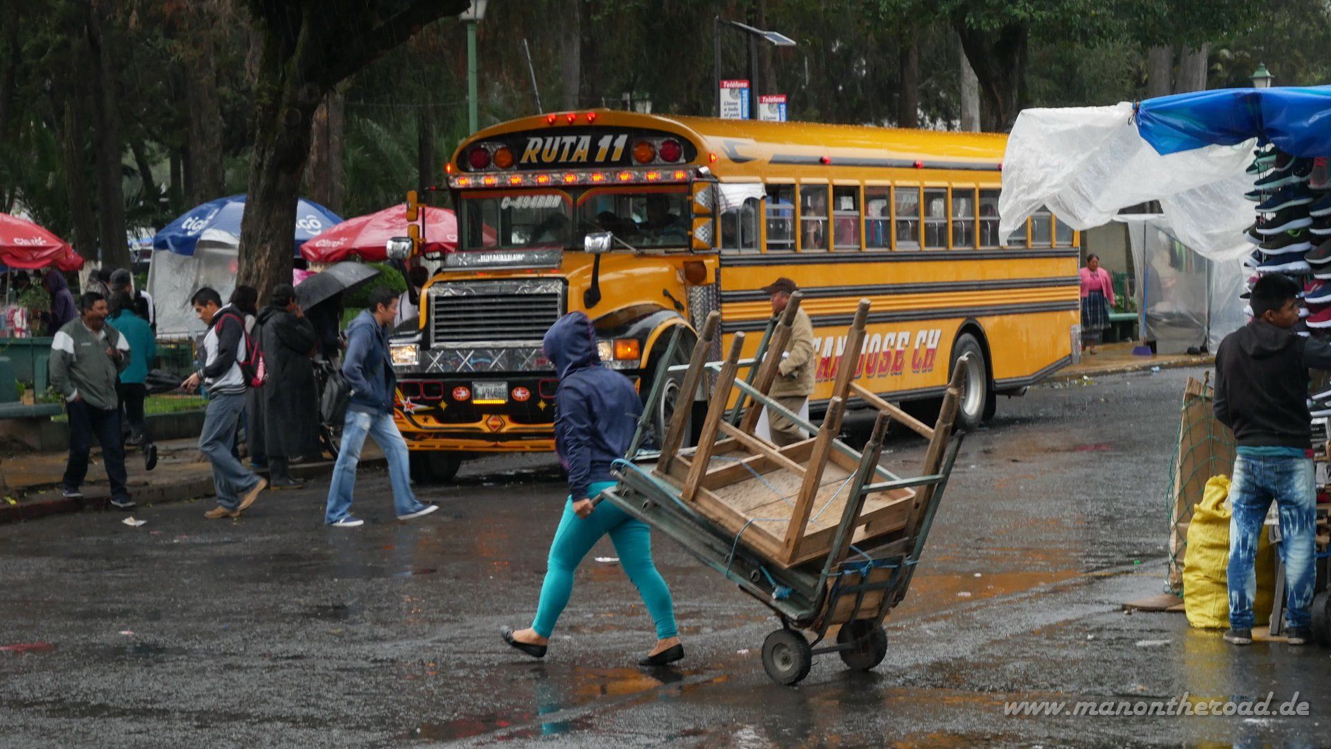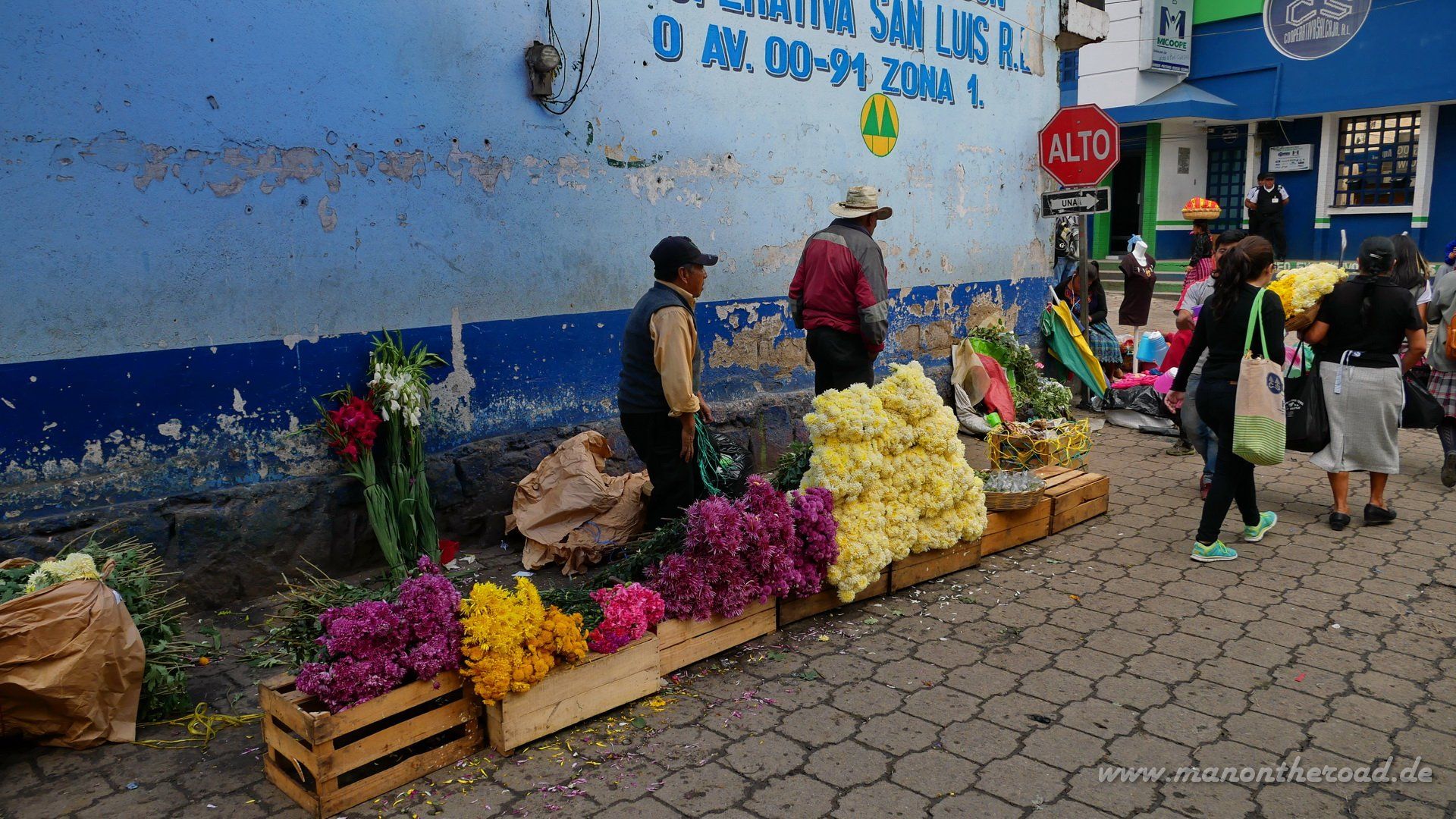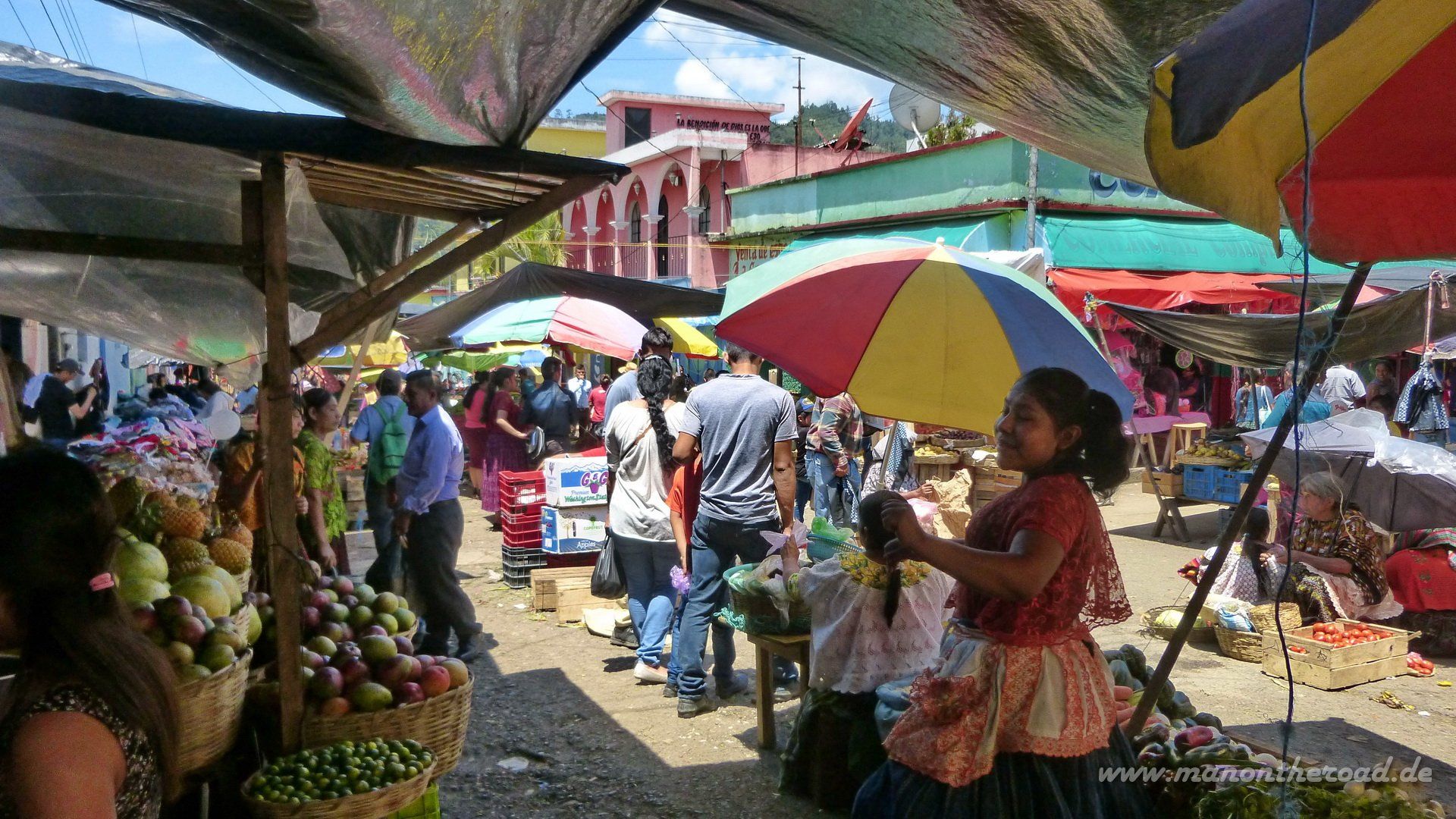 Wir überqueren die Grenze nach Guatemala mit den üblichen und etwas umständlichen Abwicklungsprozeduren. Diese Grenze hat man jetzt im Zusammenhang mit den Honduras-Flüchtlingen im Herbst 2018 auf ihrem Weg in die USA öfter im TV gesehen. In Quetzaltenango kümmern wir uns zuerst um eine Karte für den Internetzugang und unseren Hot-Spot im MAN. Die Landschaft auf dem Weg dorthin begeistert uns sofort. Es ist bergig, grün und bis in höchste Höhen landwirtschaftlich bewirtschaftet. Überall wächst Gemüse wie Kohl, Möhren, Chili, Blumenkohl, Zwiebeln und und und. Alles wird hier in mühsamer Handarbeit und mit einfachsten Werkzeugen bearbeitet. Die Menschen hier sind zierlich und klein und fast alle tragen noch die bunte Tracht. Das gefällt uns sehr gut. Alle lachen und sind superfreundlich, winken und grüßen. Das ist sehr erfrischend nach den verschlossenen und mürrisch dreinblickenden Mexikanern. Die Straßenszenen sprechen ja für sich.