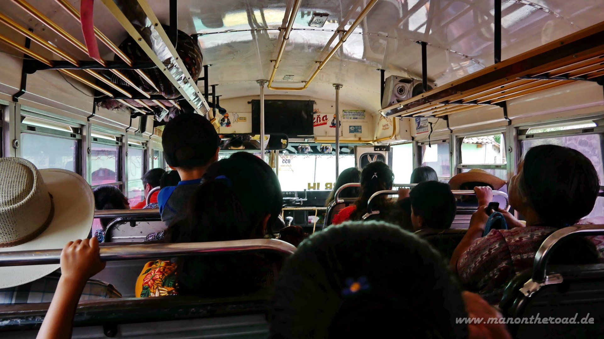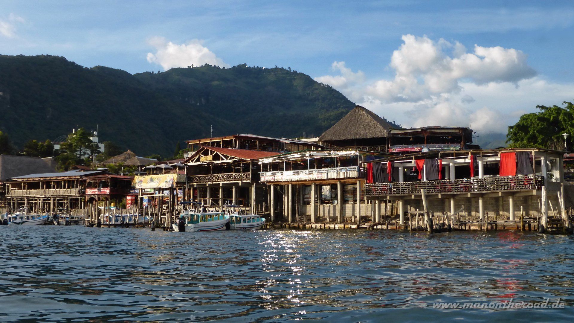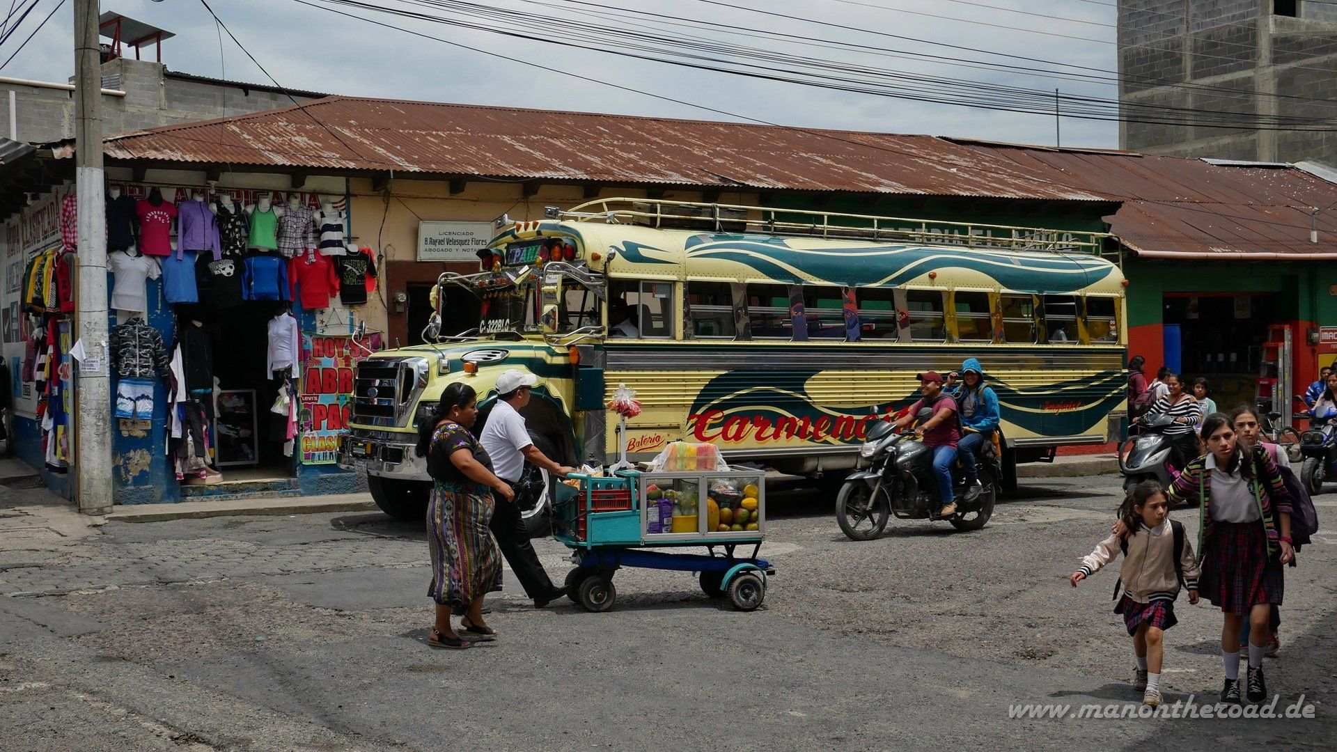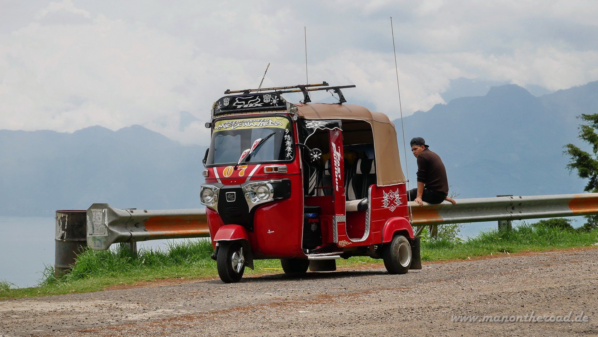 Pana, wie die Amerikaner die kleine Stadt hier nennen, ist das laute, staubige und pulsierende Zentrum hier am See. Wir wollen einen empfohlenden Aussichtspunkt auf einem der umliegenden Berge erreichen und fahren hierzu zuerst mit einem alten amerikanischen Schulbus in die Innenstadt. Von dort mit einem weiteren Bus den Berg hinauf bis zu einem kleinen Ort. Den restlichen Weg wollen wir weiter zu Fuss den steilen Berg hinauf bewältigen. Nach einer halben Stunde fragen wir einen Einheimischen, wie weit es denn zum Mirador noch sei. Seine eher unkonkrete Handbewegung mit einer ungefähren Angabe lässt uns zweifeln. Also immer weiter den steilen Weg nach oben, bis plötzlich ein TucTuc vorbeikommt. Wir halten es an und zwängen uns alle 4 in das wackelige Gefährt. Der Fahrer erzählt uns, dass eigentlich nur 3 Leute transportiert werden dürfen, aber wir überreden ihn. In mühsamem Schritttempo quälen wir das Gefährt den Berg bis zum Aussichtspunkt. Der einmalig schön gelegene und von vier Vulkanen umrahmte See ist wirklich eine Postkartenansicht. Wir bitten den Fahrer zu warten, bieten ihm ein Stück unserer mitgebrachten Pizza an und fahren nach einer halben Stunde wieder mit ihm den Berg hinunter.