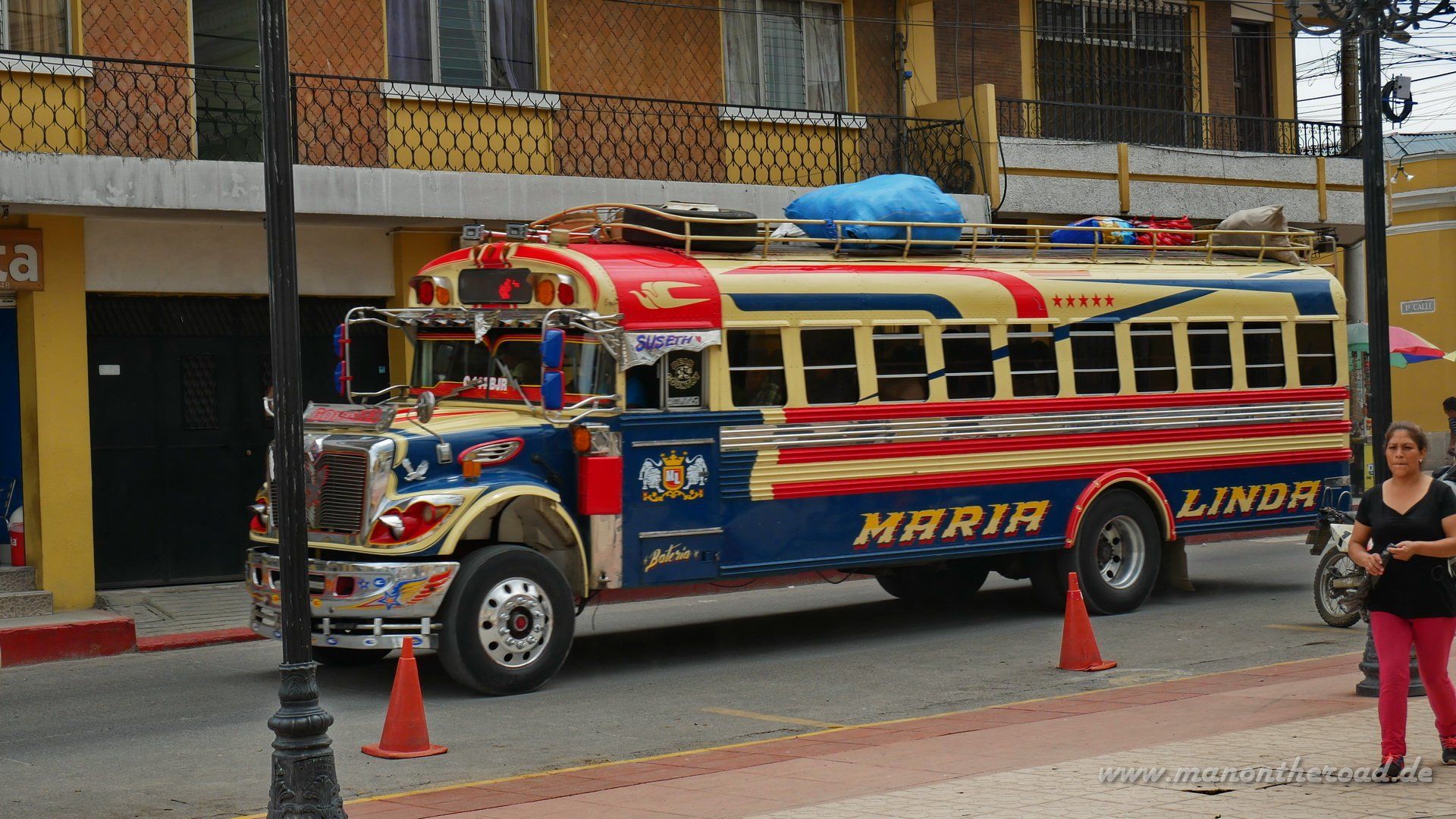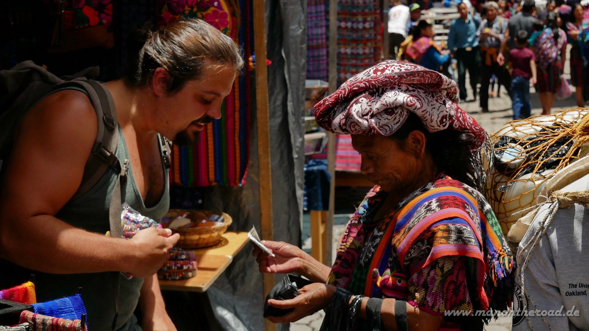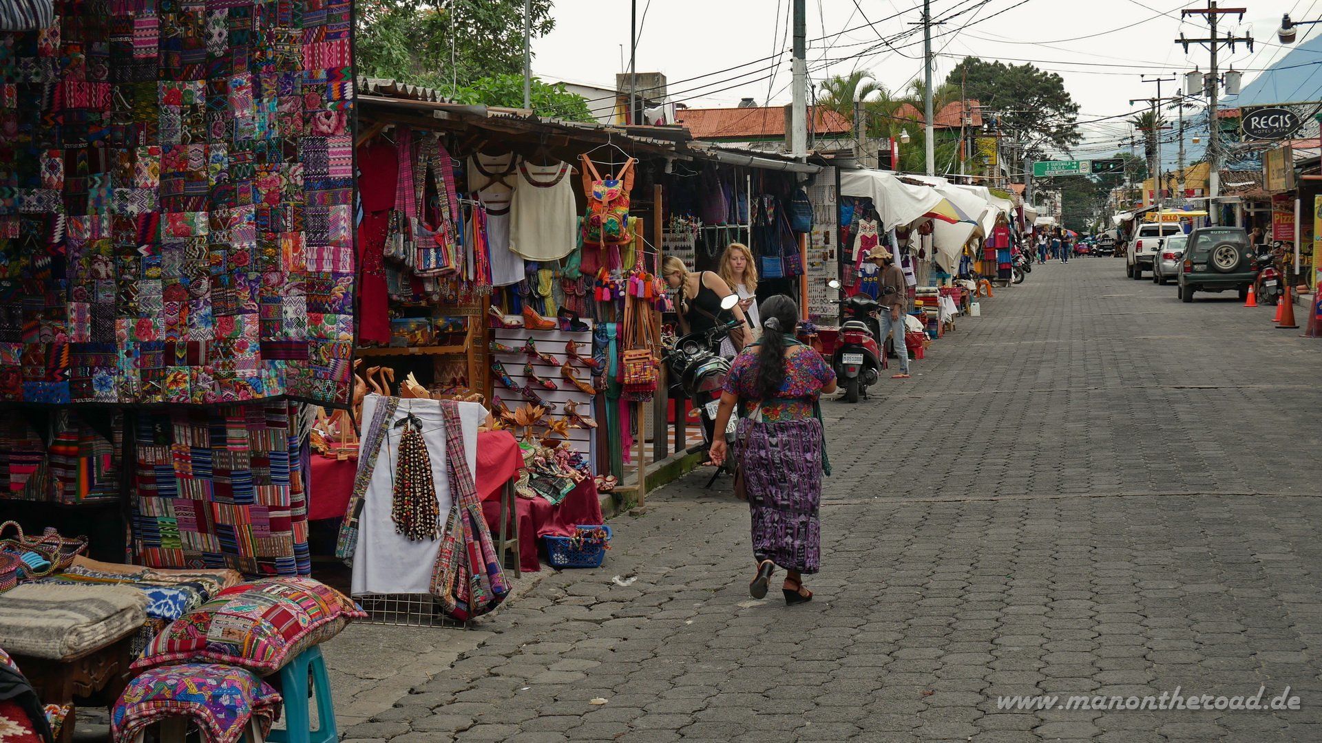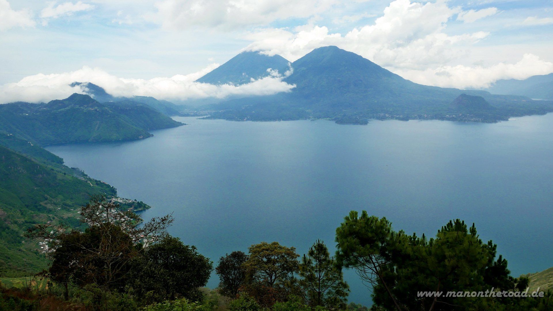 Pana, wie die Amerikaner die kleine Stadt hier nennen, ist das laute, staubige und pulsierende Zentrum hier am See. Wir wollen einen empfohlenden Aussichtspunkt auf einem der umliegenden Berge erreichen und fahren hierzu zuerst mit einem alten amerikanischen Schulbus in die Innenstadt. Von dort mit einem weiteren Bus den Berg hinauf bis zu einem kleinen Ort. Den restlichen Weg wollen wir weiter zu Fuss den steilen Berg hinauf bewältigen. Nach einer halben Stunde fragen wir einen Einheimischen, wie weit es denn zum Mirador noch sei. Seine eher unkonkrete Handbewegung mit einer ungefähren Angabe lässt uns zweifeln. Also immer weiter den steilen Weg nach oben, bis plötzlich ein TucTuc vorbeikommt. Wir halten es an und zwängen uns alle 4 in das wackelige Gefährt. Der Fahrer erzählt uns, dass eigentlich nur 3 Leute transportiert werden dürfen, aber wir überreden ihn. In mühsamem Schritttempo quälen wir das Gefährt den Berg bis zum Aussichtspunkt. Der einmalig schön gelegene und von vier Vulkanen umrahmte See ist wirklich eine Postkartenansicht. Wir bitten den Fahrer zu warten, bieten ihm ein Stück unserer mitgebrachten Pizza an und fahren nach einer halben Stunde wieder mit ihm den Berg hinunter.