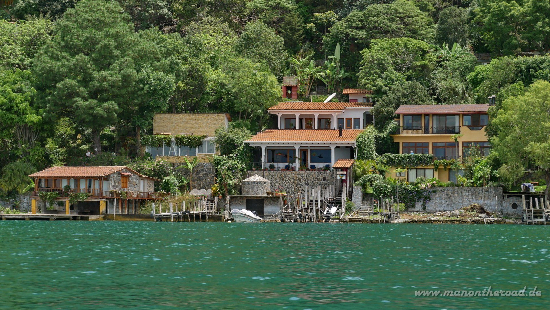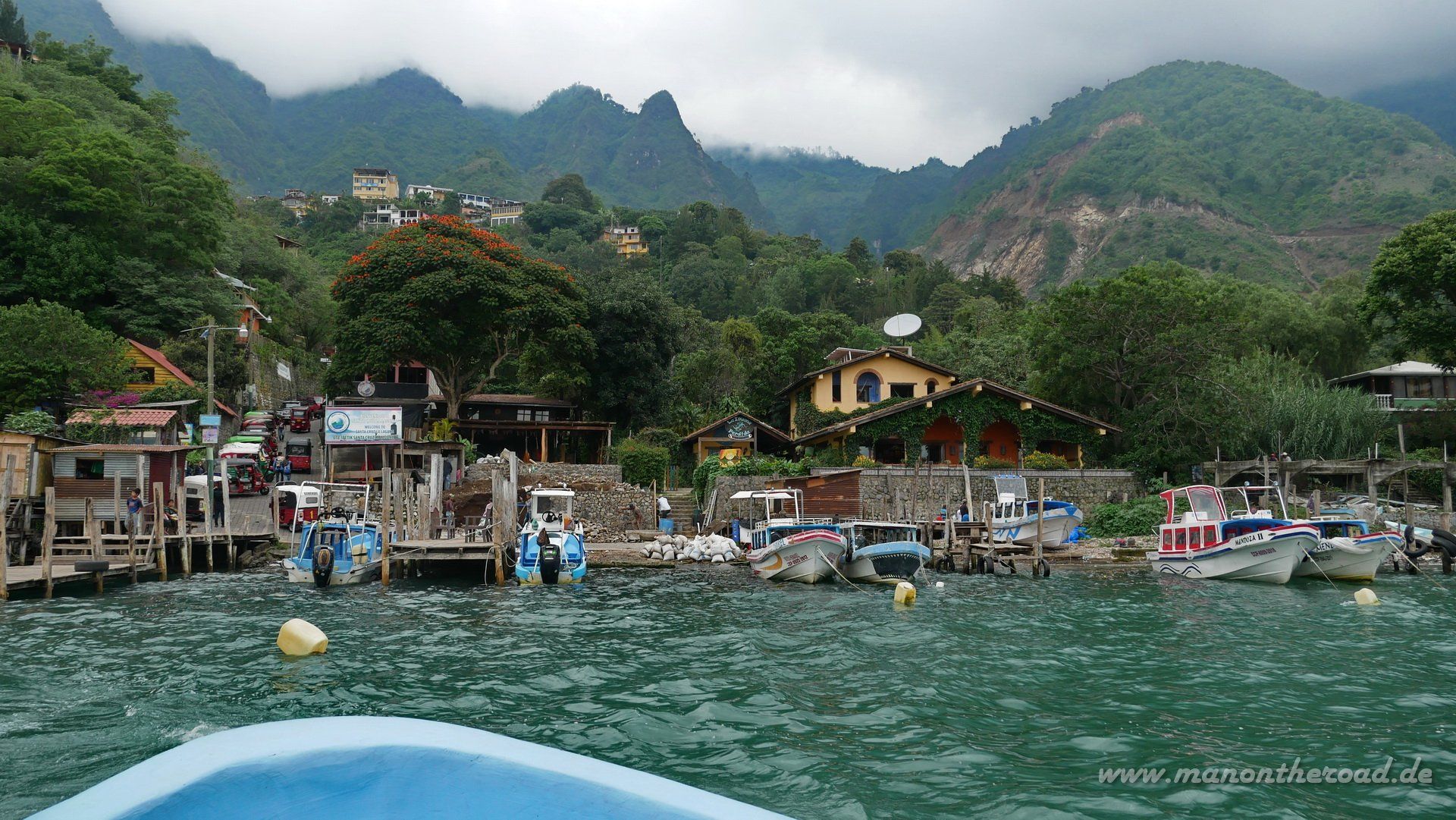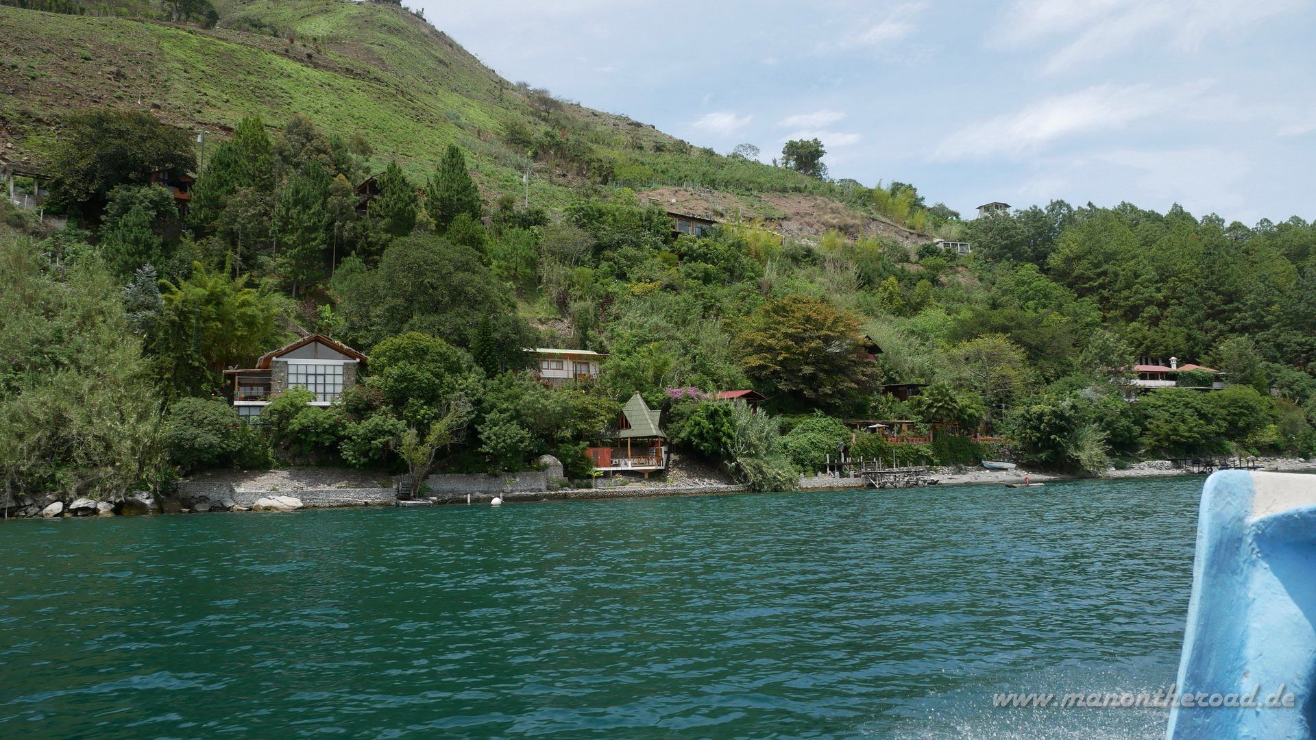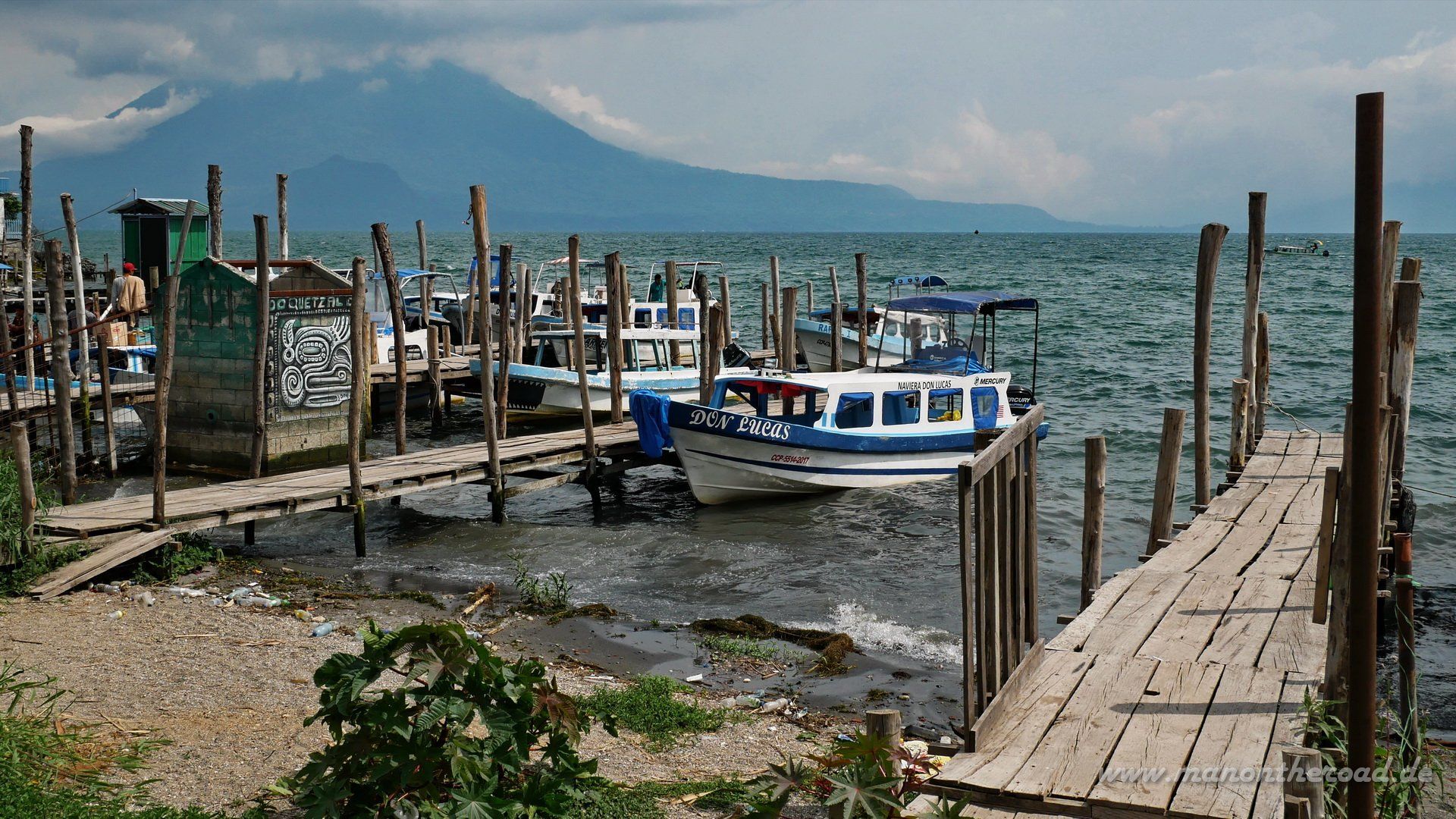 Der Blick aus dem Fenster auf den Vulkan und den ruhigen See ist wirklich paradiesisch. Wir gehen zum Steg und schwimmen eine halbe Stunde im ruhigen und erfrischenden Wasser des Sees. Später nehmen wir vom gleichen Steg ein Boot-Taxi. Dazu muss man einfach winken, wenn sich eines der vielen Boote nähert und wir schippern entlang der netten Häuser der Amerikaner, die sich hier auf den Sahneschnittchen der Uferflächen sehr schöne Gartenanlagen und Villen errichtet haben. Der quirlige Hauptort Panajachel ist bereits auf die Touristen eingestellt. Es gibt eine Verkaufsbude mit Kleidern und Kunsthandwerk neben der anderen, sowie unzählige Kneipen, Restaurants und Cafés. Zurück auf dem schönen Campingplatz treffen wir ein junges schweizer Pärchen mit 2 Kleinkindern und werden von den beiden auf einen Teller Kürbissuppe sowie etwas Schweizer-Käse eingeladen. Sie hatten den Ausbruch des Volcano de Fuego in Antigua erlebt und waren seit Tagen damit beschäftigt Ihr Fahrzeug und ihre Ausrüstung zu reinigen.