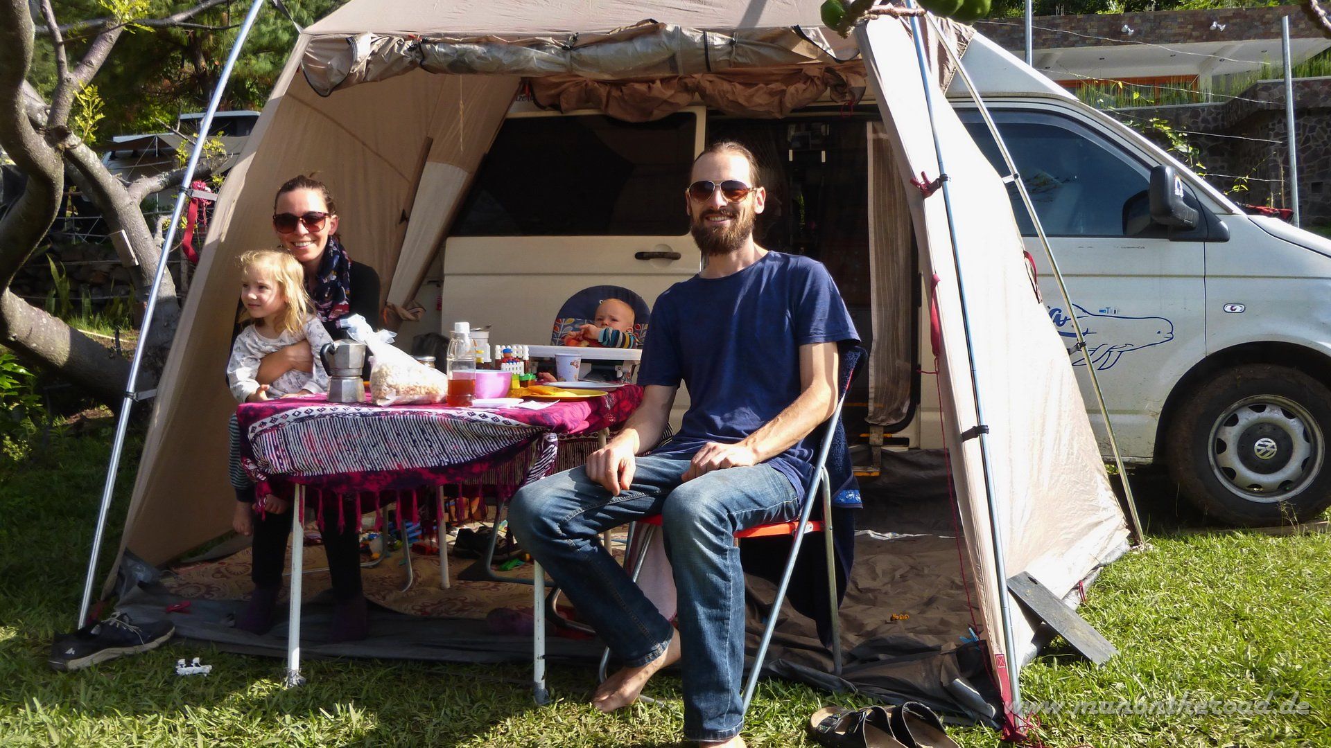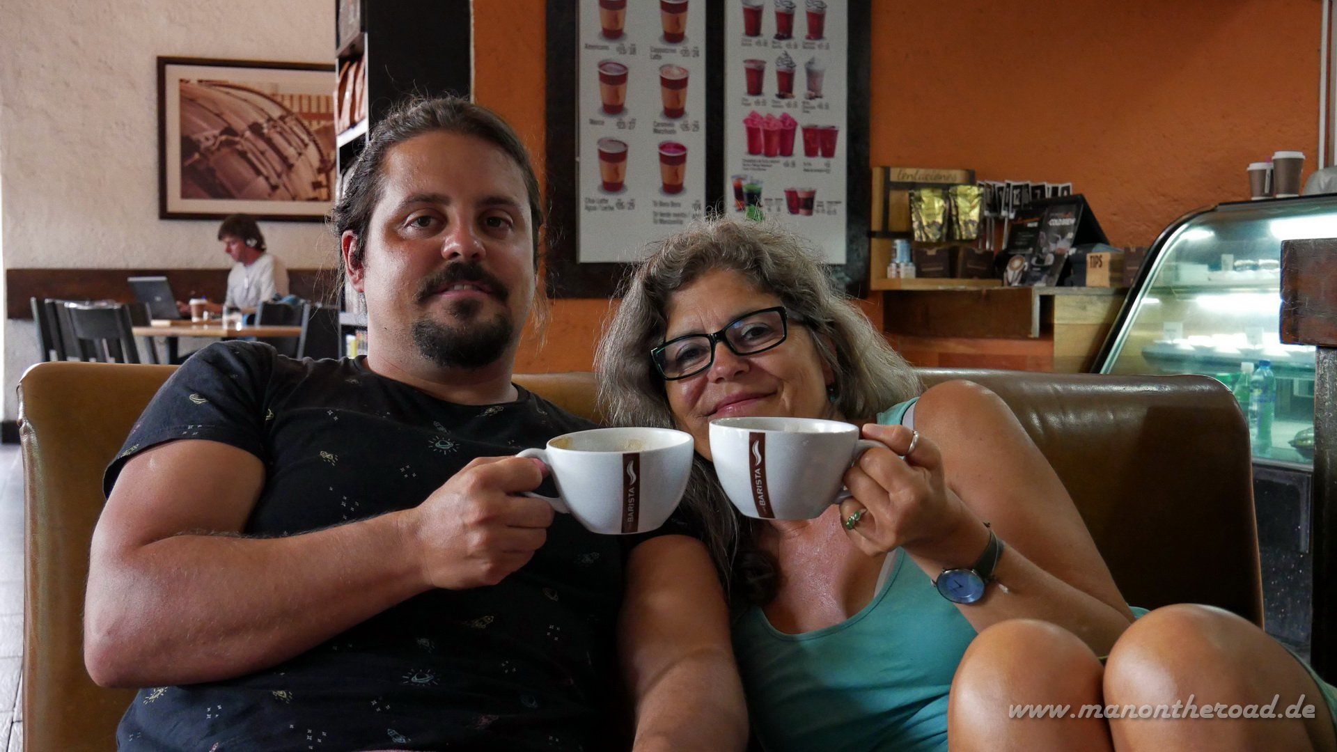 Am Flughafen in Guatemala Ciudad kommen die Beiden auch pünktlich und geschafft vom 22-stündigen Flugstress an. Wir haben bereits vorher einen schönen Schlafplatz für uns alle in der Cabana Suiza gebucht, einer Anlage oberhalb der Stadt. Die beiden haben ein geräumiges Zimmer und wir können auf der Wiese stehen, ohne dafür einen Cent zu zahlen.