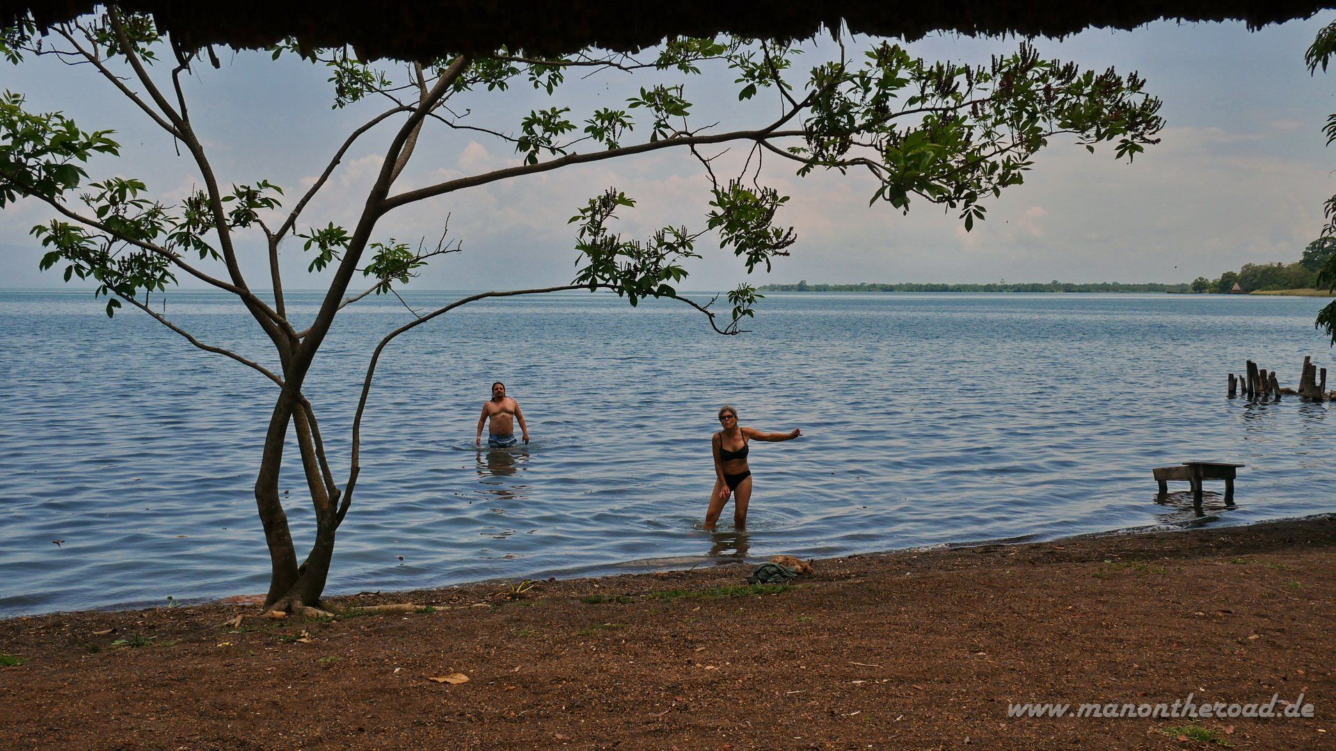 Von hier aus fahren wir zum grossen und ruhigen Lago Izabal, bezahlen einem dort lebenden Mann ein paar Groschen um seinen Zugang zu einer schönen Fläche unter Palapas am See zu benutzen. Wir baden auch hier wieder ausgiebig und knüpfen im Palapa unsere Hängematte zwischen die Pfosten. Am Abend finden wir in San Felipe ein hübsches, kleines Hotel mit Pool zum Übernachten. Wir dürfen mit unserem MAN direkt neben dem Zimmer von David und Claudia parken. Auch mit frisch gekochtem Essen werden wir dort versorgt. Anschließend noch ein paar Runden im Pool und ab ins Bett.