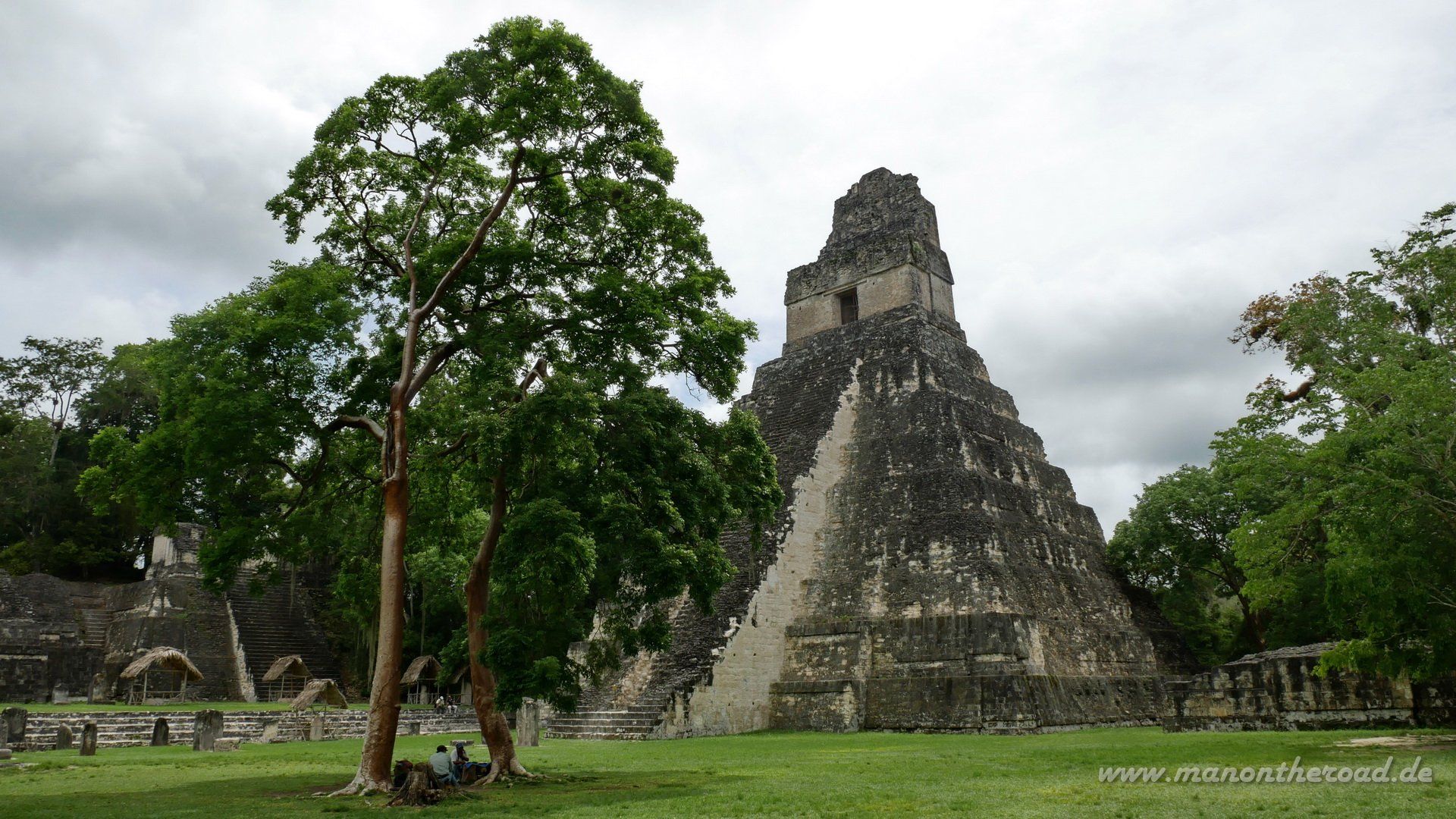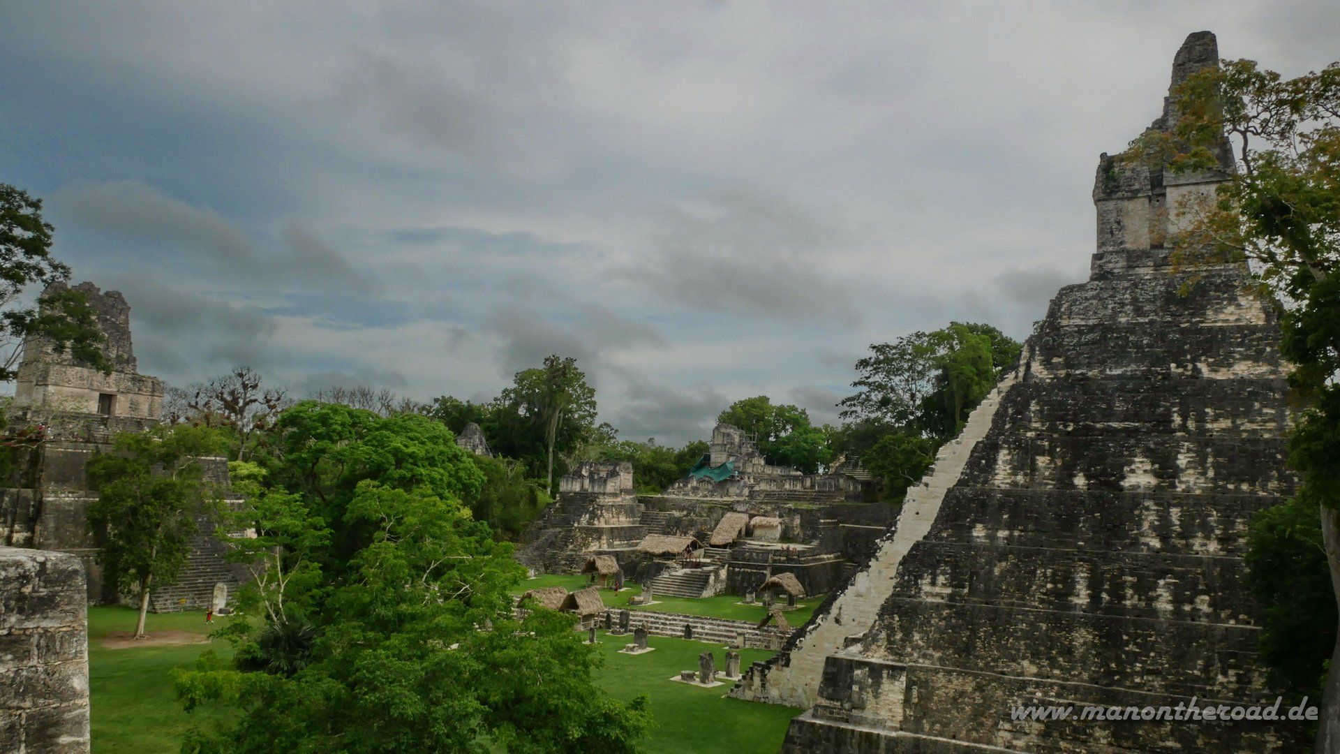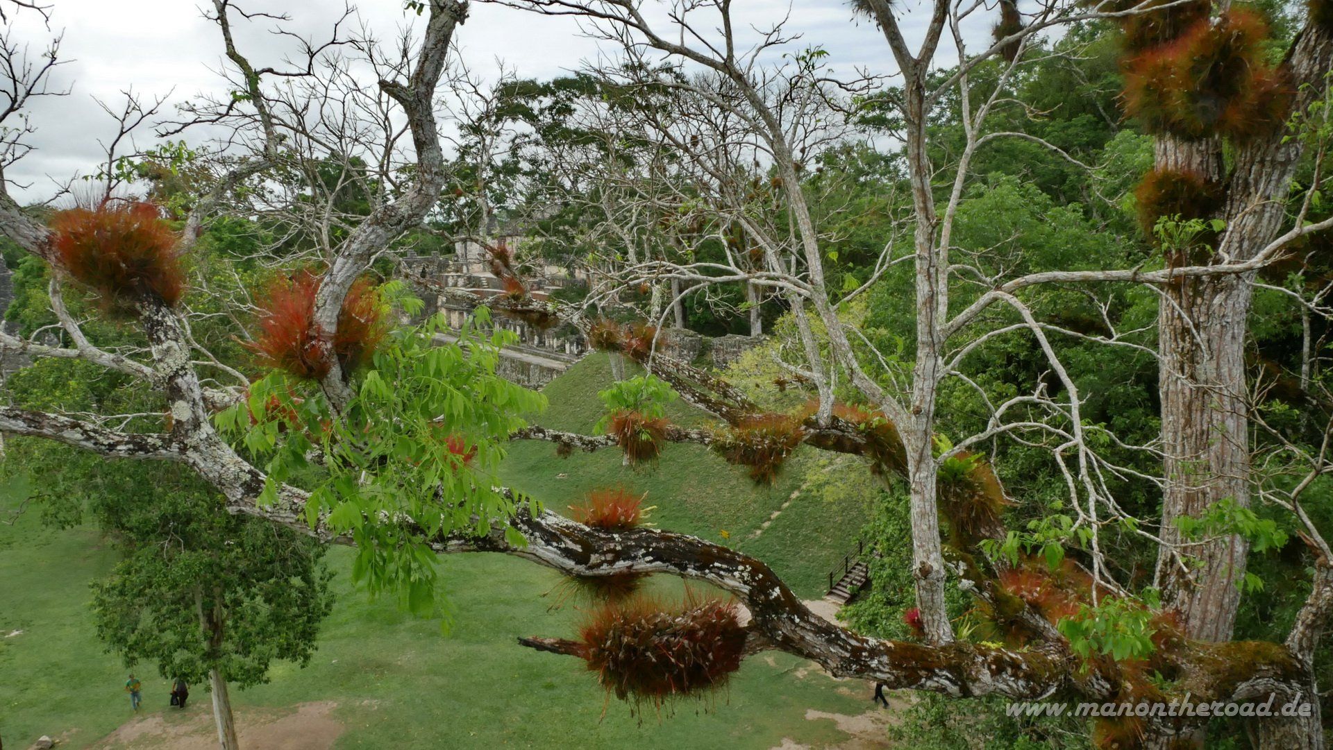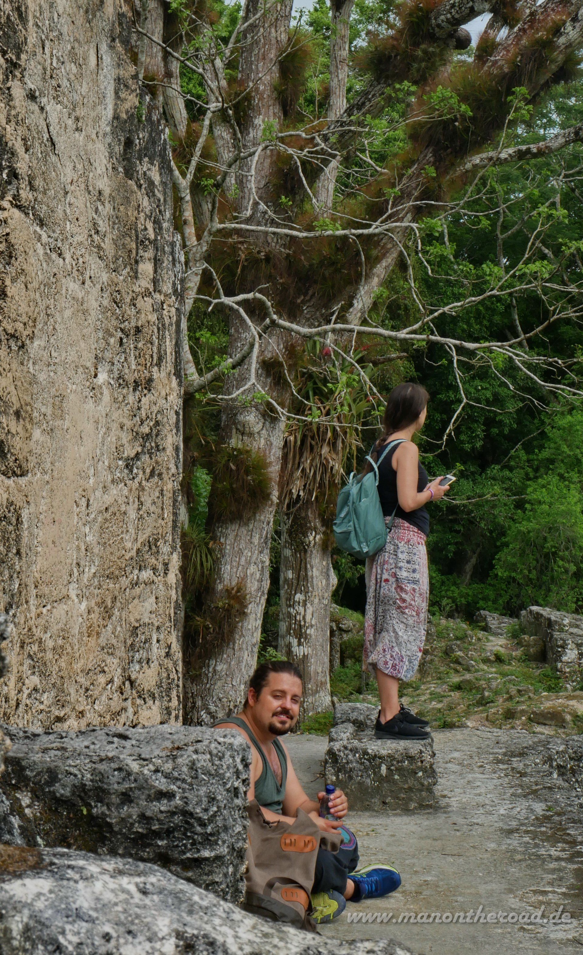Unsere nächste Anlaufstelle ist die berühmte Maya-Ausgrabung Tikal. Leider gestaltet sich das Buchen eines Zimmers dort eher unangenehm. Die Preise sind unverschämt und das wollen die beiden nicht ausgeben, zumal im Internet-Portal booking.com die angegebenen Übernachtungspreise extrem niedriger sind. Nachdem wir das 3. Hotel abgeklappert haben, wollen die beiden über das Portal das Zimmer reservieren. Der Hotel-Mensch will dafür aber nicht das WiFi-Passwort rausrücken. Also bestellen die beiden im Restaurant ein Bier und bekommen dann das Passwort. Obwohl das Hotel komplett leer ist, bekommen die beiden dann ein Zimmer, welches völlig abgelegen nach einem weiten Marsch durch Dschungellandschaft im Dunkel zu erreichen ist. Auf der Treppe sitzt dann auch gleich zur Begrüßung eine Tarantel! Auch unser Stellplatz auf der grünen Wiese ist eine Zumutung. Die ganze Anlage ist völlig unbeleuchtet und man sieht die Hand nicht vor Augen. Wenn wir nicht mit einer starken Taschenlampe nach David und Claudia auf die Suche gegangen wären, hätten die uns zum Abendessen nie gefunden. Die Anlage selbst war sehr schön, aber für Michael und mich, die ja bereits vorher einige Maya-Ausgrabungen gesehen hatten, nicht mehr so aufregend. Dazu kam die beinahe unerträgliche Hitze und Schwüle. David hat ausserdem jetzt starke Übelkeit und muss sich in der Anlage übergeben. Als wir die Anlage verlassen wollen, geht bereits der nächste Stress los. Angeblich hätten wir nicht fürs Campen bezahlt. Wir haben aber am Abend zuvor dem einweisenden Mann das Geld gegeben. Es wird behauptet, er sei überhaupt nicht berechtigt gewesen. Also bin ich dann noch ewig von Einem zum Anderen gerannt um die Angelegenheit zu klären. Plötzlich waren alle irgendwo verschwunden und wir sind ziemlich genervt einfach weitergefahren, ohne noch weiter zu Fragen. Alles in Allem hat uns Tikal eher genervt.