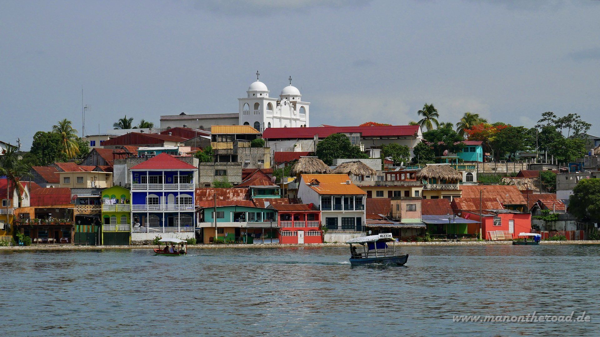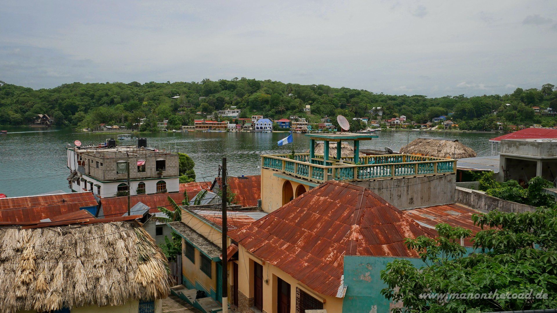 Zurück aus Belize ist die Inselstadt Flores, die auf einer kleinen Insel im Lago Peten Itza liegt, einen Besuch wert. Leider kommen wir erst im Dunkeln an und der in der Traveller App iOverlander beschriebene Stellplatz ist leider wegen Stromausfall nicht zu benutzen. Der Besitzer lässt uns über Nacht vor dem Grundstück stehen und schickt David und Claudia hinunter ins Dorf, wo die beiden in einem schönen kleinen Hotel mit Namen Casa Grethel unterkommen und wir alle zusammen auf dem Holzsteg des dazugehörigen Restaurants zu Abend essen.