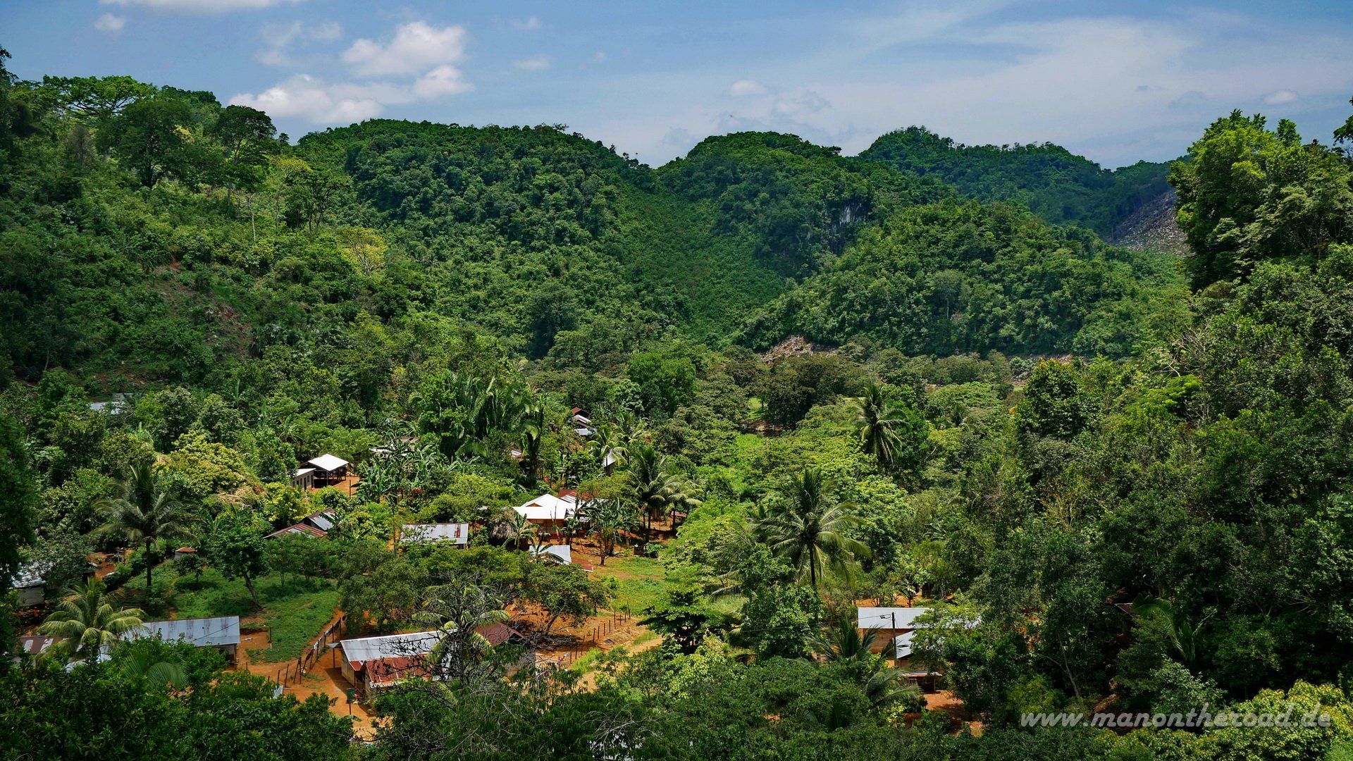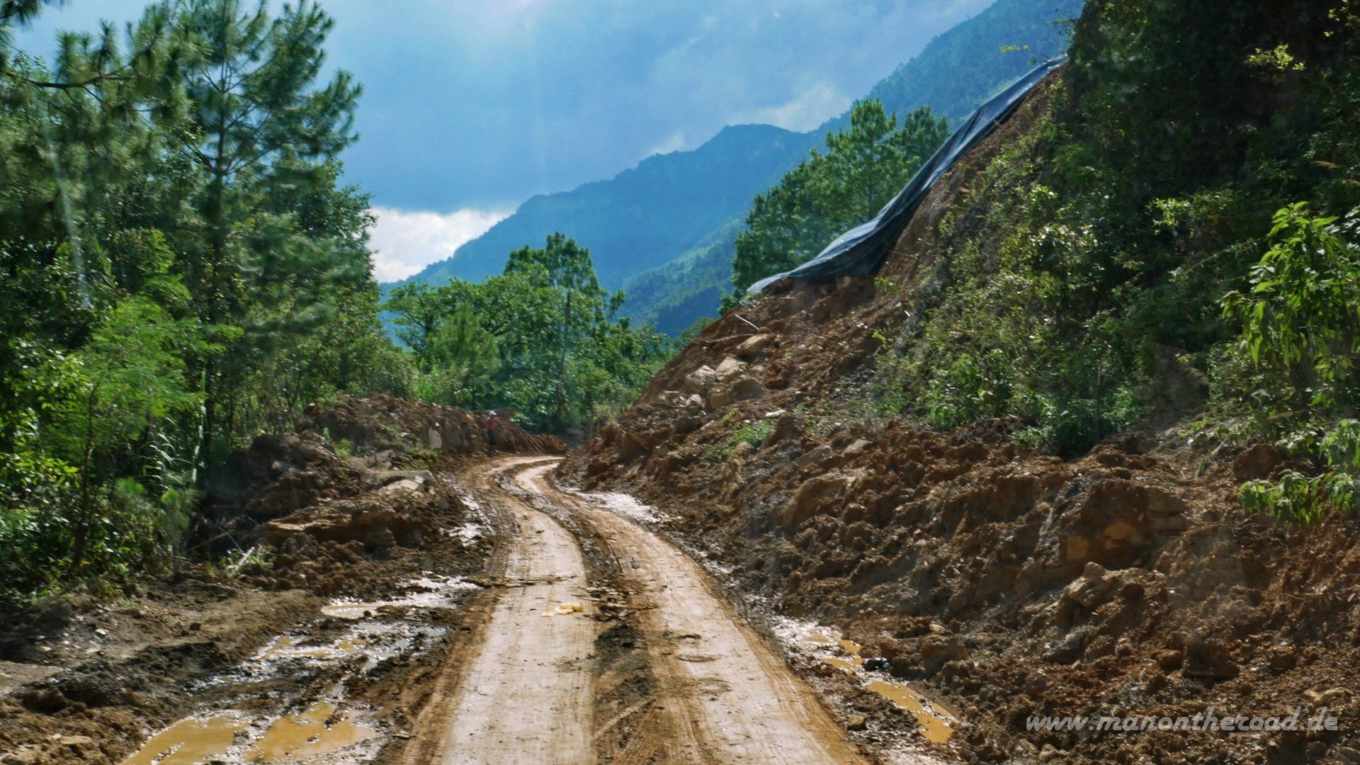 Die Teerstrasse endet plötzlich und weiter geht es in den nächsten Stunden über eine mal gute, mal ziemlich holprige Piste durch das Bergland von Guatemala. Immer wieder schöne Ausblicke entschädigen für das Gerüttel. Doch dann bekommen wir auch noch einen Platten, weil Michael einen Felsvorsprung im Dunkeln übersieht und ein Reifen komplett aufgeschlitzt wird. Kurze Zeit später kommt auch noch ein Polizist dazu und erklärt uns, dass wir hier auf der Piste nicht stehenbleiben könnten, obwohl neben uns noch ausreichend Platz ist. Na, vielen Dank auch für diesen Hinweis. Wir ignorieren den Intelligenzbolzen und arbeiten weiter am Reifenwechsel. Wir sind gerade fertig, da beginnt ein richtiges Tropengewitter mit strömendem Regen, Blitz und Donner. Im Dunkeln erreichen wir in Lanquin das Hotel für David und Claudia im Dunkeln und sind komplett durchnässt, bis wir die paar Meter zur Rezeption zurückgelegt haben.