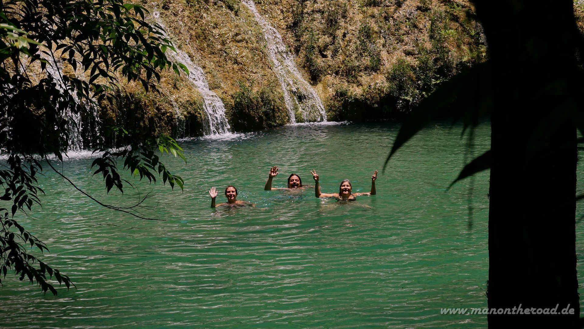 Am nächsten Morgen hängt der Nebel zwischen den Bergen und wir begeben uns auf die letzten 10 km der Zufahrt. Dies ist eine echte Herausforderung. Wir benötigen über eine Stunde und rumpeln über eine unglaublich enge, steinige und steile Piste, wobei die beiden hinten sitzenden durchgeschüttelt werden wie Fallobst. Die Terrassen von Semuc Champey entschädigen dann aber für alles. Sauberes Wasser fließt über unzählige Wasserfälle in Sinterbecken und von dort in das nächste und nächste... Es ist wie im Paradies. Wir schwimmen den halben Tag herum und Michael klettert für den Ausblick von oben sogar eine Stunde auf einen Mirador.