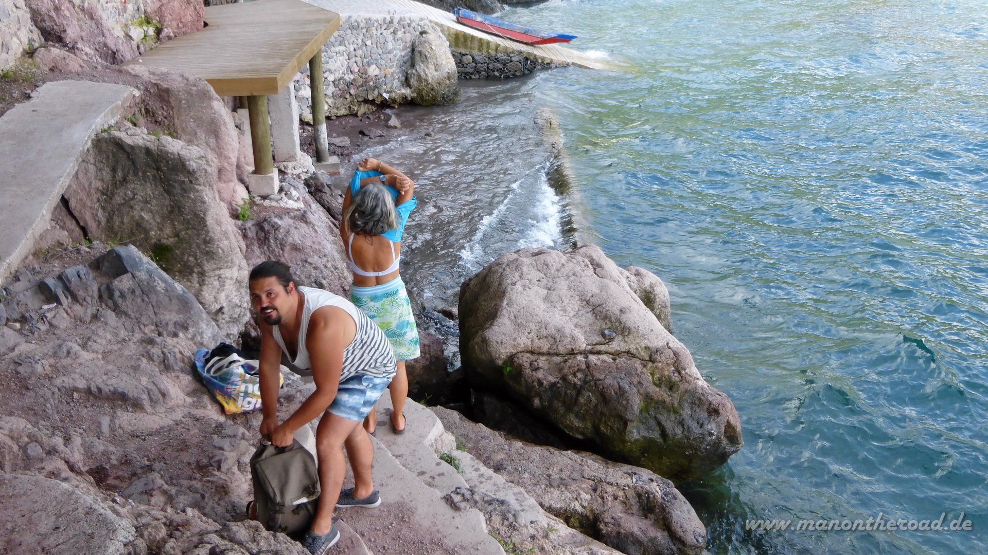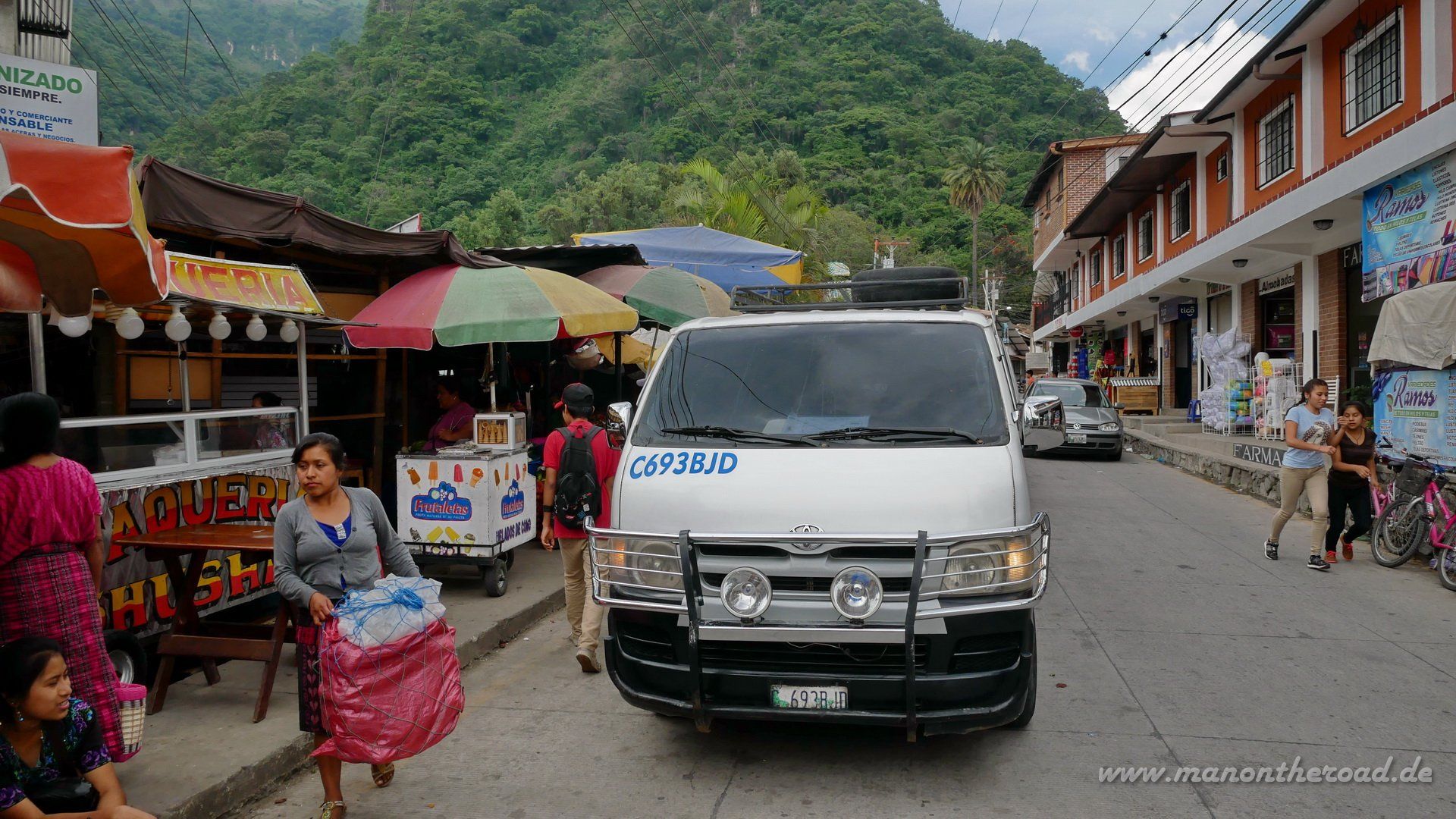 Wir wollen es heute noch zu einem interessant beschriebenen Stellplatz eines Frankokanadiers namens Pierre am Atitlan See schaffen. Diese Strecke hat es aber in sich. Nach dem Abzweig von der Panamericana ist die Strasse zunächst extrem kurvig, eng und steil, schliesslich rumpeln wir über eine superenge Piste mit riesigen Löchern, durch enge Dörfer ohne Bürgersteige und niedrig hängenden Leitungen bis wir komplett durchgeschüttelt vor einem Metalltor ankommen. Es gibt leider keinen freien Stellplatz mehr, wir dürfen aber für die Nacht auf der Zufahrt hinter dem Tor übernachten bis am nächsten Morgen ein Platz frei wird. Der Ausblick über den Atitlan-See mit den umliegenden vier Vulkanen ist unbeschreiblich schön und wir freuen uns schon auf das Schwimmen am nächsten Tag.