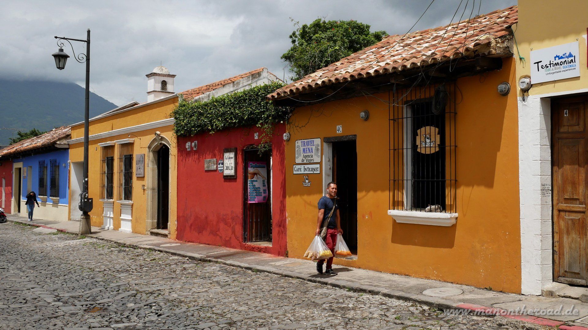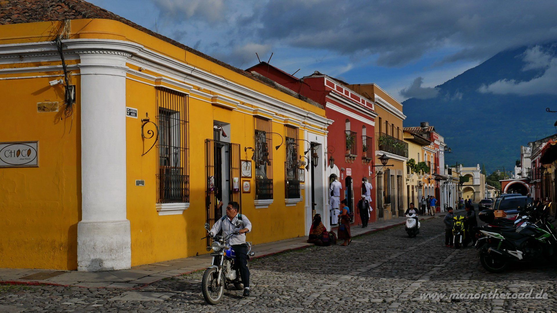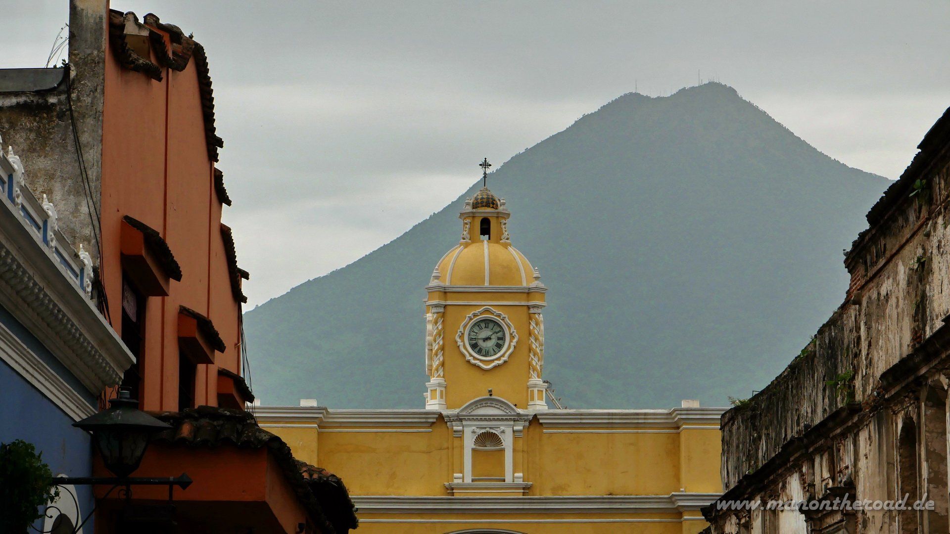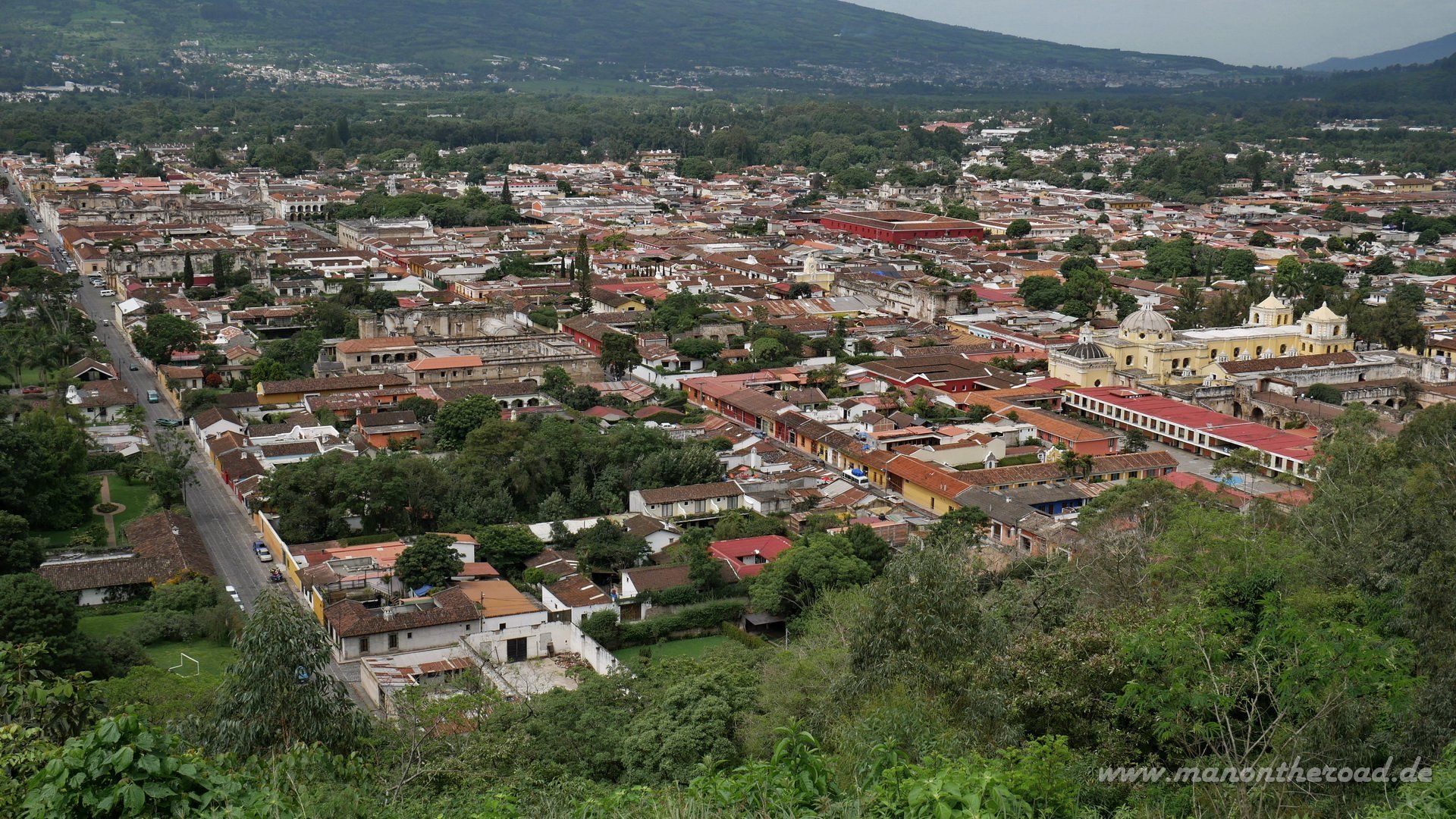 Unser nächstes Ziel ist Antigua, das Highlight der Städte Guatemalas. Bei leichtem Nieselregen erreichen wir die Stadt. Wir finden ein schönes Hostal für David und Claudia und wir parken auf dem Wiesengrundstück der Touristenpolizei. Antigua bezaubert durch seine flachen und in allen möglichen bunten Farben gestrichenen Häuser, seinen Kopfsteinpflaster-Straßen, den unzähligen Cafés, Restaurants, Kneipen, Boutiquen und Kunsthandwerkerläden. Wir genießen das Ambiente mit den vielen historischen Überresten von alten Kirchen und Häusern. Auch hier gibt es auf einem Berg einen Aussichtspunkt mit Blick über die ganze Stadt. Wir fahren mit 2 TucTucs nach oben, gehen später zu Fuss wieder nach unten. Der Volcano de Fuego bleibt freundlich, verhüllt sich aber in Wolken. Wir schlendern den ganzen Nachmittag durch die Gassen und lassen uns von den riesigen Souvenirläden zum Kauf des ein oder anderen Stücks verleiten.