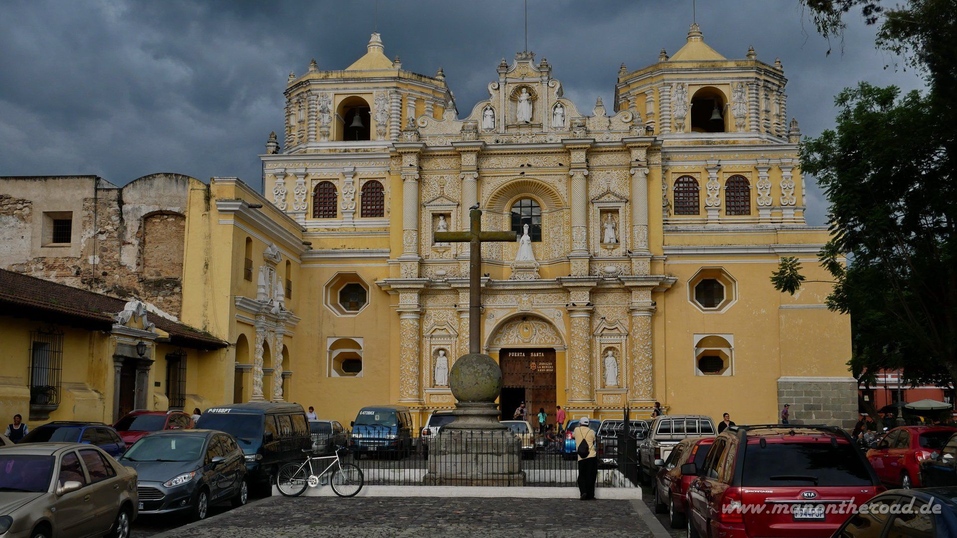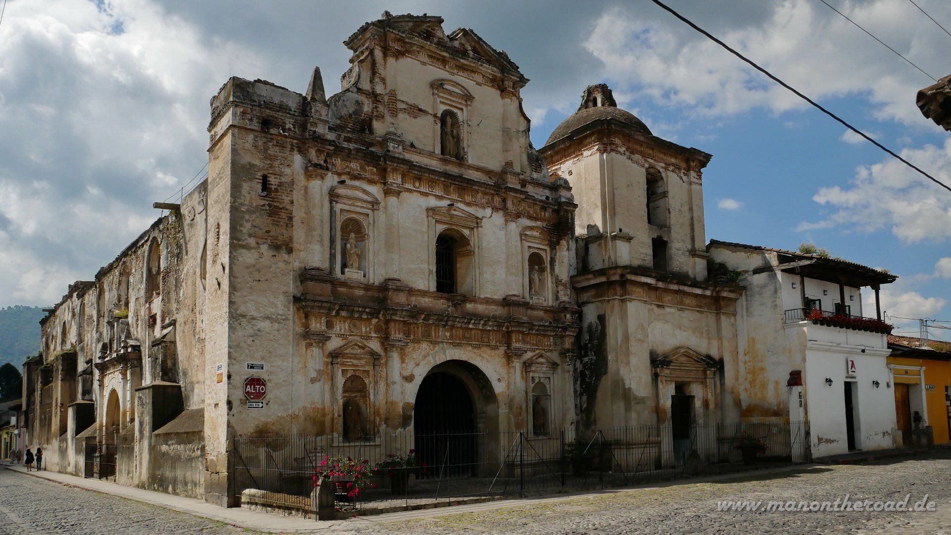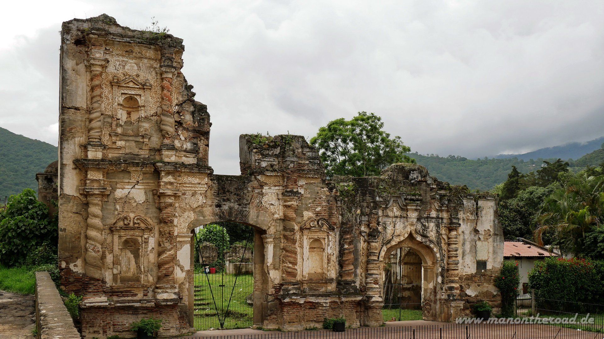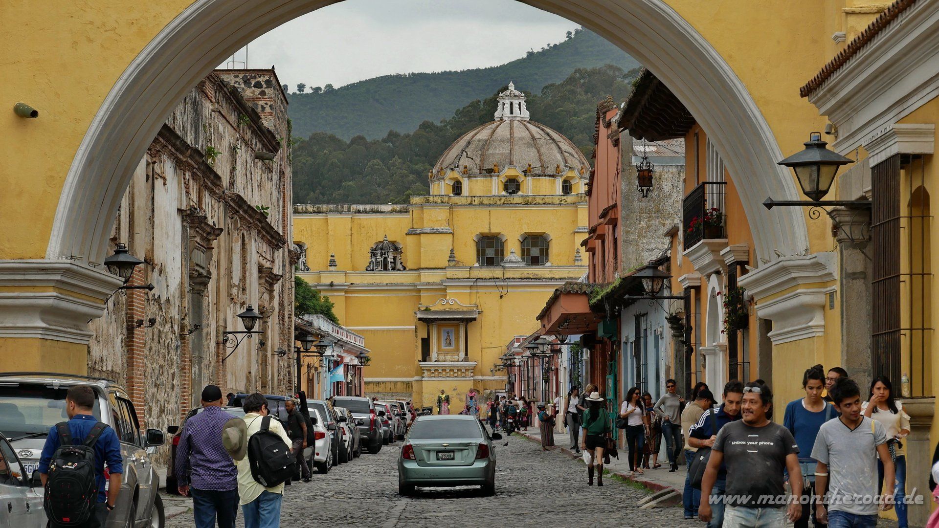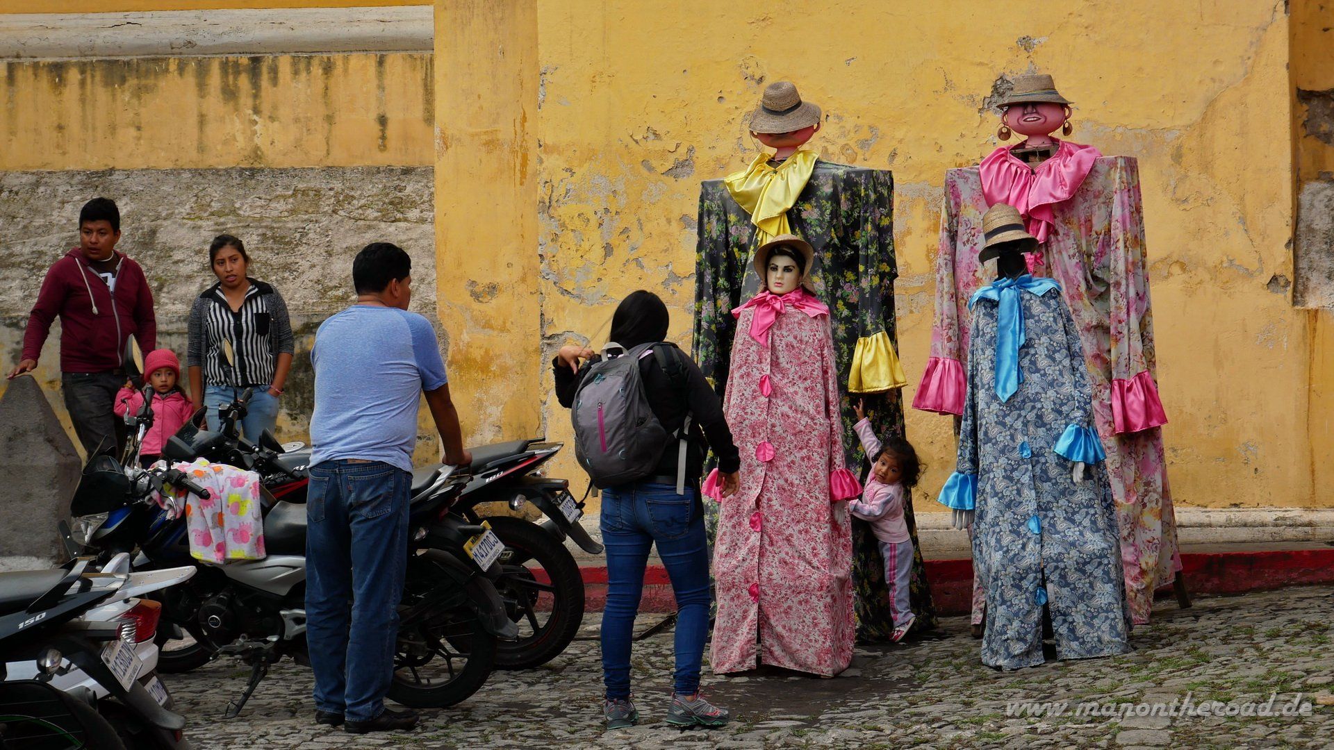 Unser nächstes Ziel ist Antigua, das Highlight der Städte Guatemalas. Bei leichtem Nieselregen erreichen wir die Stadt. Wir finden ein schönes Hostal für David und Claudia und wir parken auf dem Wiesengrundstück der Touristenpolizei. Antigua bezaubert durch seine flachen und in allen möglichen bunten Farben gestrichenen Häuser, seinen Kopfsteinpflaster-Straßen, den unzähligen Cafés, Restaurants, Kneipen, Boutiquen und Kunsthandwerkerläden. Wir genießen das Ambiente mit den vielen historischen Überresten von alten Kirchen und Häusern. Auch hier gibt es auf einem Berg einen Aussichtspunkt mit Blick über die ganze Stadt. Wir fahren mit 2 TucTucs nach oben, gehen später zu Fuss wieder nach unten. Der Volcano de Fuego bleibt freundlich, verhüllt sich aber in Wolken. Wir schlendern den ganzen Nachmittag durch die Gassen und lassen uns von den riesigen Souvenirläden zum Kauf des ein oder anderen Stücks verleiten.