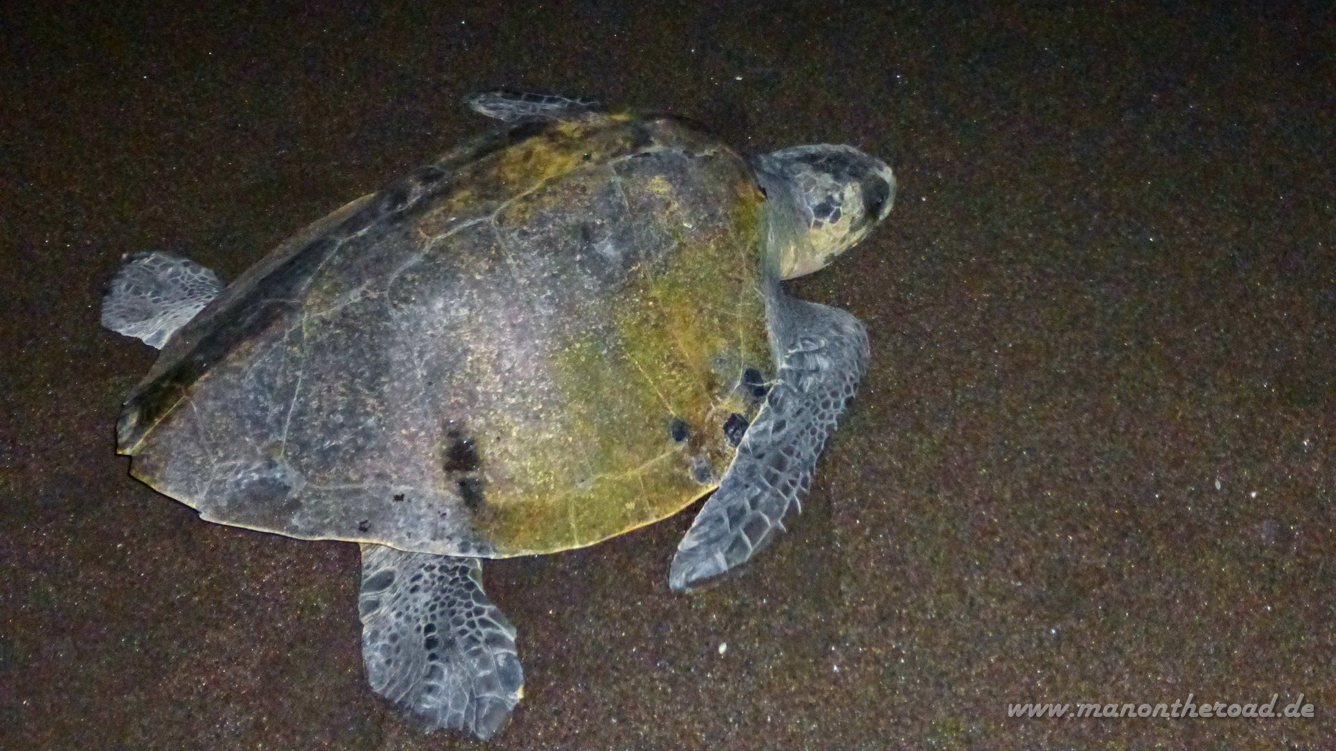 An dem Strand an dem wir stehen kommen nachts die großen Oliv-Bastard-Schildkröten zur Eiablage aus dem Wasser. Diese Tiere werden bis 70 cm groß und bis zu 50 kg schwer. Die Babys sind beim Ausschlüpfen 4 cm groß und wiegen 18-20 g. Es werden zwischen 80 und 160 Eier pro Eiablage gezählt. Die Eier bleiben ca. 65 Tage im warmen Sand, bis die Kleinen dann ausschlüpfen und den gefährlichen Weg ins Meer bewältigen müssen. Natürlich warten im Meer weitere Fressfeinde, so dass nur ein geringer Teil der Tiere überlebt. Wir nehmen uns einen Guia und im Dunkeln stapfen wir vorsichtig und leise mit unseren Taschenlampen über den Strand. Tatsächlich entdecken wir ein Exemplar auf dem Weg ins Wasser. Es sind noch andere Gruppen mit Führer unterwegs und wir dürfen nur kurz die Taschenlampe für ein Foto benutzen und uns dem Tier auch nicht zu sehr nähern, um es nicht zu stören.